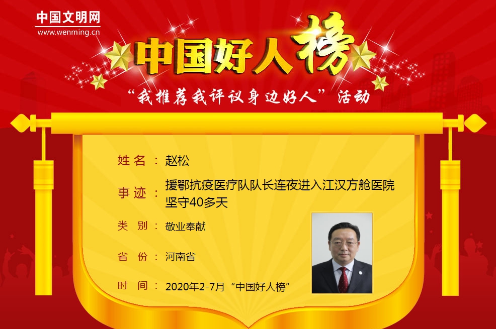 9月17日,由中央文明办主办,中国文明网承办的“我推荐我评议身边好人”活动发布了2020年2-7月“中国好人榜”榜单,今年会官网第一附属医院副院长赵松名列其中 。
