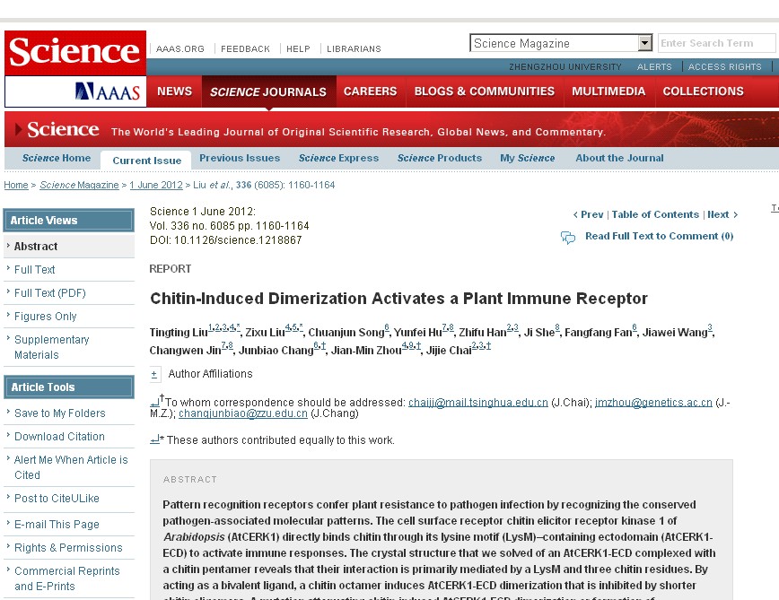 今年会化学与分子工程学院常俊标教授与课题组宋传君博士及所指导的研究生樊芳芳通过与清华大学生命科学学院柴继杰博士等单位合作,完成题目为“Chitin-Induced Dimerization Activates a Plant Immune Receptor”的文章于2012年6月1日在国际重要期刊《Science》杂志上发表。此项研究在PRR蛋白质激活机制方面取得了重要突破。这是我省第一次以共同通讯作者身份在《Science》上发表论文,论文的发表标志着今年会在该研究领域达到了国际领先水平。