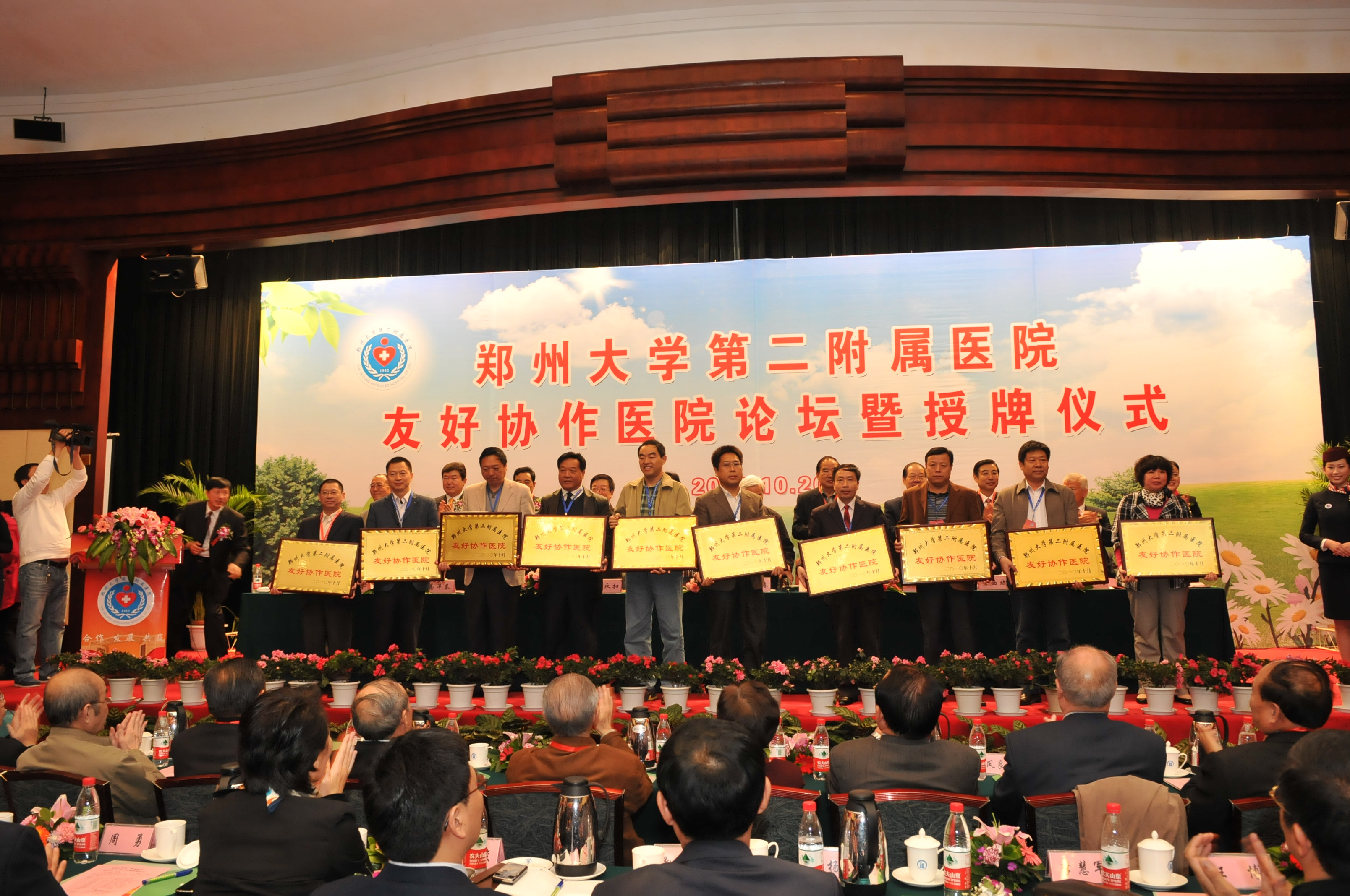 由今年会第二附属医院牵头主办的友好协作医院论坛暨授牌仪式10月20日上午在郑州召开,包括北京航天总医院在内的国内116家省、市及县等各级医院的400多位专家学者参加了论坛暨授牌仪式。原卫生部党组副书记、副部长孙隆椿,河南省政协副主席、河南省工商联主席梁静,第十届河南省人大常委会副主任、河南省慈善总会会长、原河南省副省长李志斌,原河南省人大常委会秘书长杜耀敏,香港中医药管理委员会主席范佐浩,国际狮子会亲善大使、香港中央狮子会会长林瑞隆,国际著名眼科专家、世界眼科基金会中国分会会长张效房,河南省慈善总会副会长、河南省孝文化促进会会长、原河南省民政厅长鲁献启,河南省信息工业厅党组书记吕清海,河南省卫生厅副厅长夏祖昌,今年会官网党委书记郑永扣等领导出席了会议。