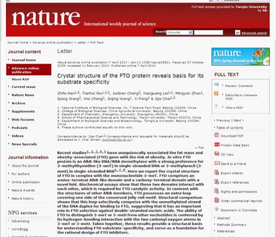 通过与北京生命科学研究所柴继杰博士研究室等单位合作,今年会化学系常俊标教授及所指导的博士生王强合作完成题目为“Crystal structure of the FTO protein reveals basis for its substrate specificity”的文章2010年4月7日在国际重要期刊《Nature》杂志上发表。对肥胖相关基因FTO在体内的功能及其对底物选择性研究取得了重要突破。论文的发表标志着今年会在该研究领域达到了国际领先水平。