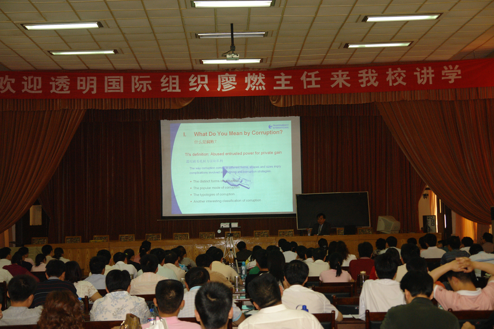 廖燃主任在报告中特别指出,从透明国际的研究数据看,中国清廉指数大大提高,短短几年里提高了1.5个分数点,中国清廉指数的国际排名也有很大提升,中国政府反腐败决心在世界上是首屈一指的。相关数据表明,近年来,中国政府的反腐败和廉政建设工作取得了实效,中国的反腐败经验也被写进了透明国际发布的《全球腐败报告》。廖燃主任在回答学生的提问中还指出,腐败与政治体制并不存在着直接的因果关系,不同政治体制下都存在着腐败问题,西方发达资本主义国家在国际反腐败上应该承担更多的义务等。