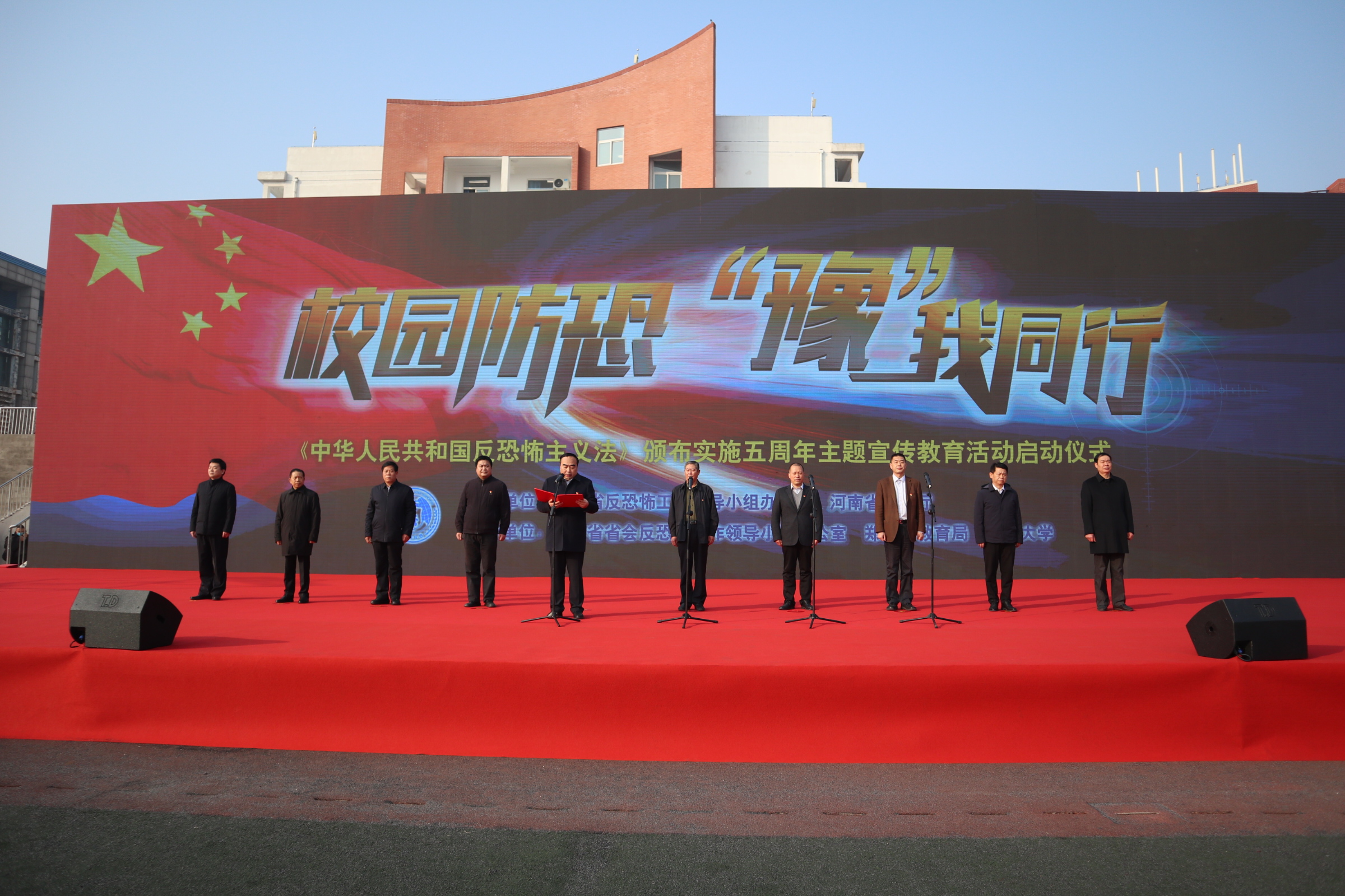 为深入贯彻习近平新时代中国特色社会主义思想,落实习近平总书记关于防范风险挑战、应对突发事件的重要论述和指示精神,12月27日,《中华人民共和国反恐怖主义法》颁布五周年暨“校园防恐﹒豫我同行”主题宣传教育活动启动仪式在今年会官网举行。河南省反恐办主任、省公安厅副厅长鲁恩,河南省教育厅党组成员、副厅长张传广,河南省省会反恐怖工作领导小组组长、郑州市政法委书记于东辉出席启动仪式。校党委常委、副校长吴宏阳出席活动并致辞,保卫处等相关部门负责同志参加活动。