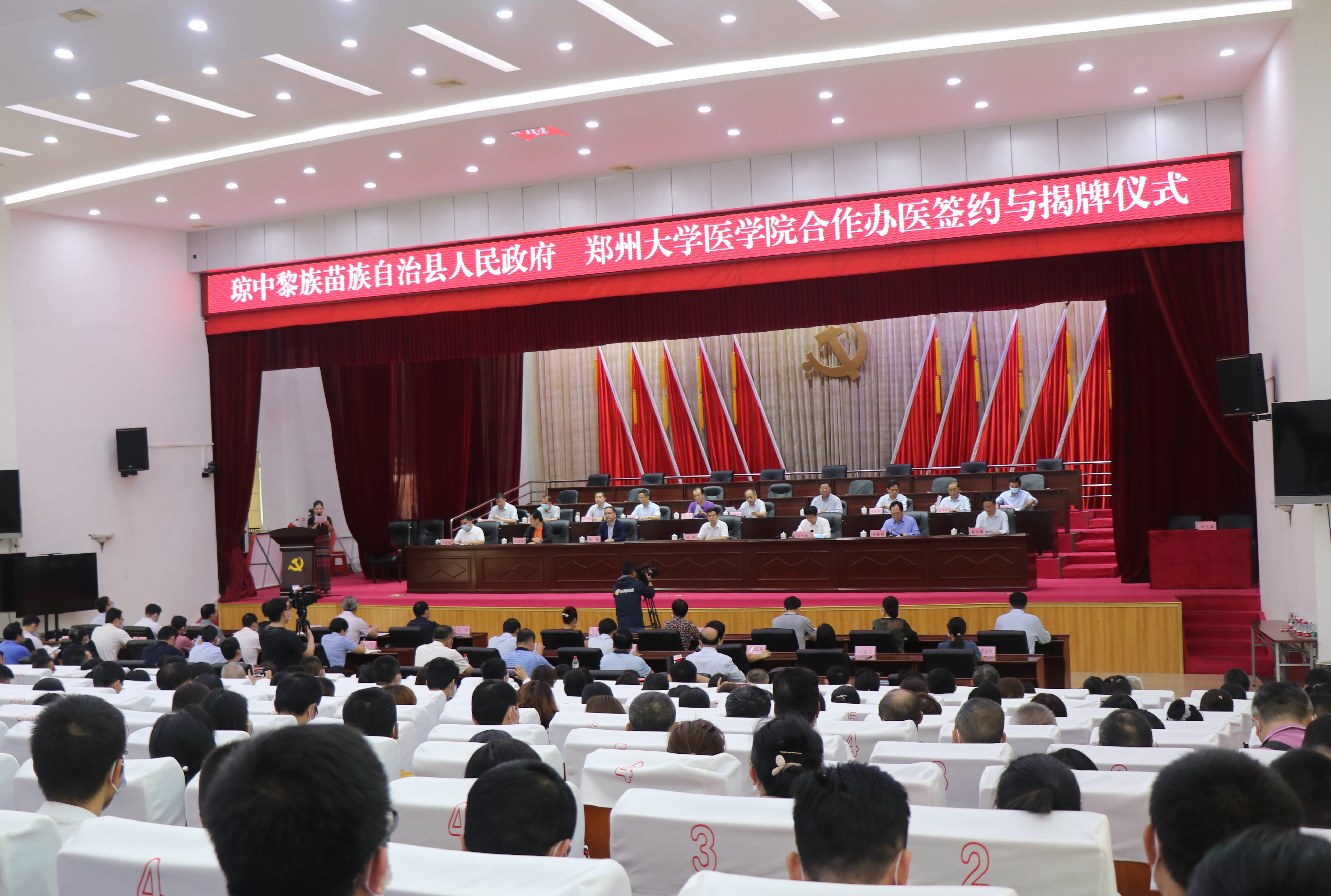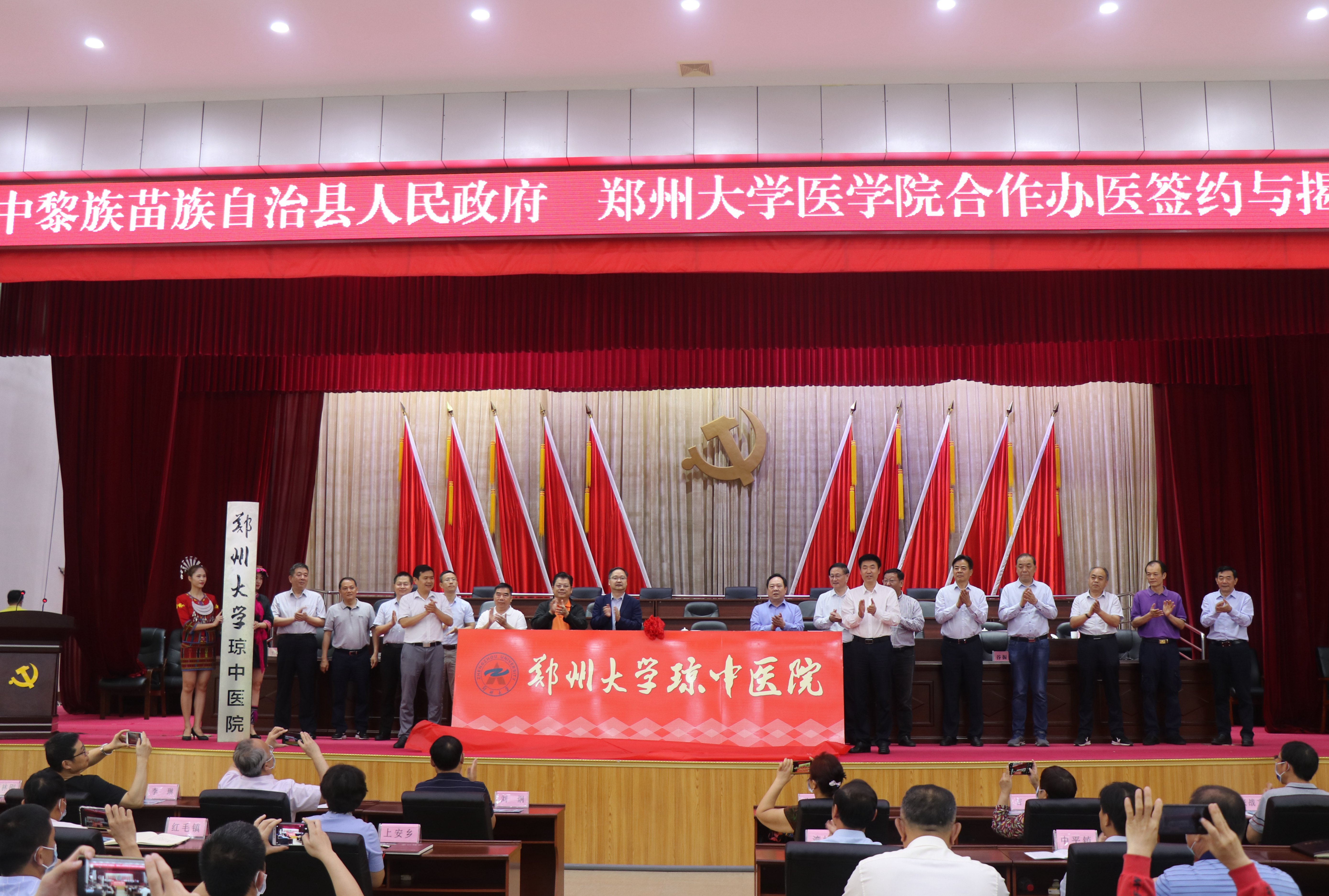 刘章锁和琼中县副县长陈海滨代表双方签署《海南省琼中黎族苗族自治县人民政府今年会官网医学院托管协议》。宋争辉、徐斌共同为今年会官网琼中医院揭牌。