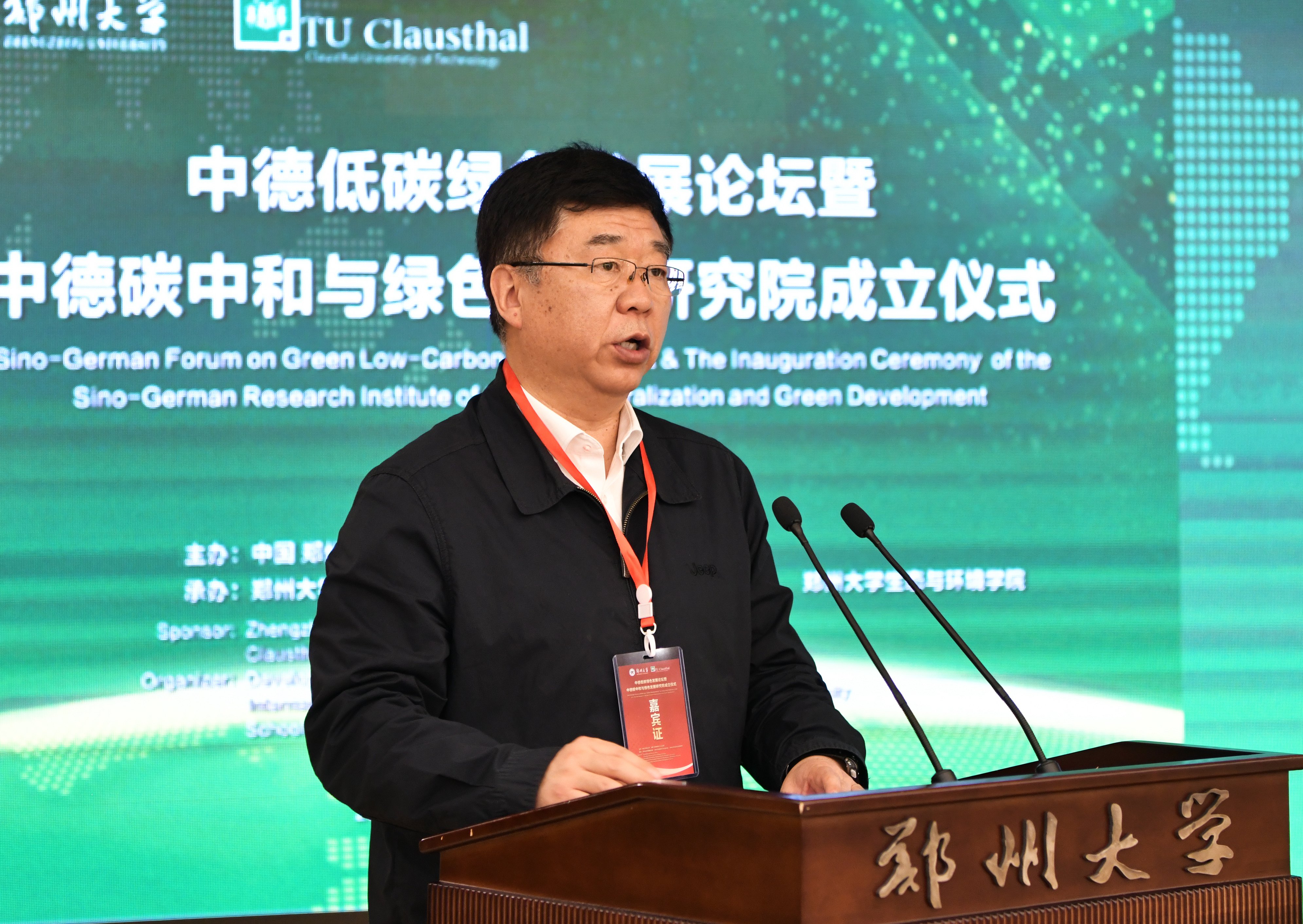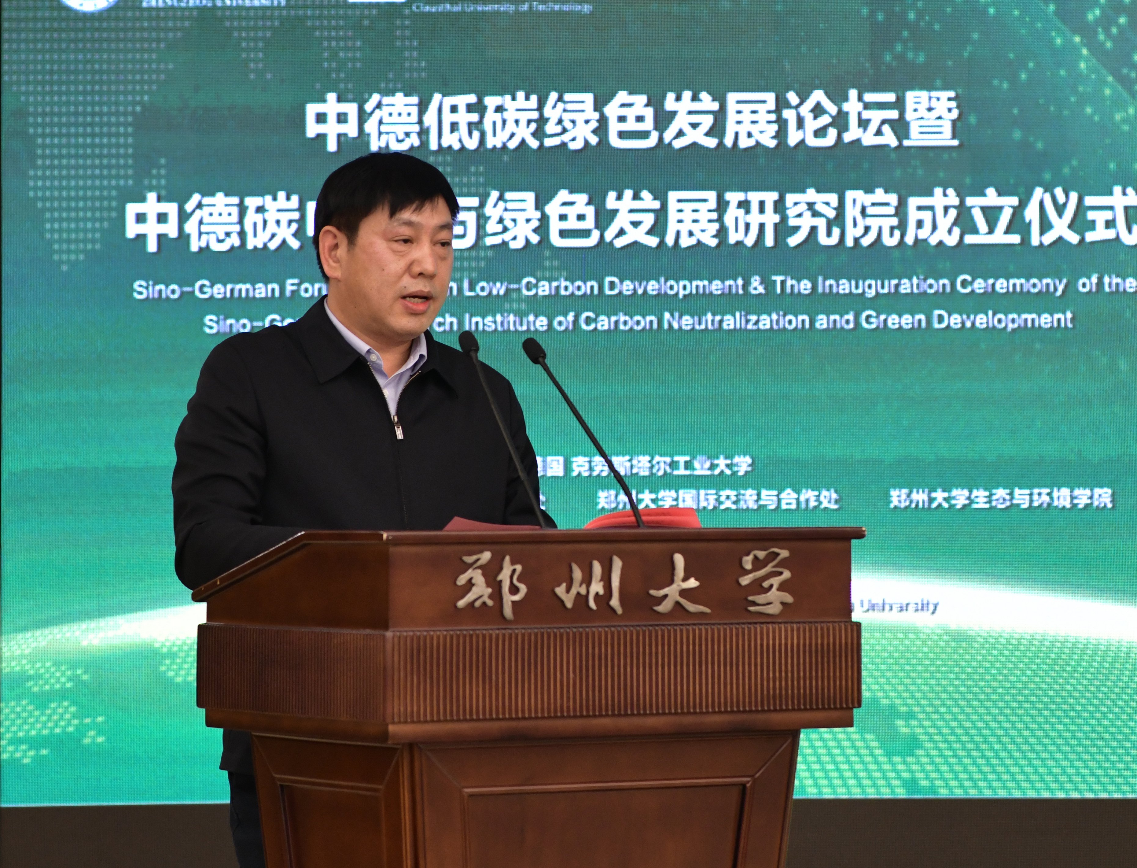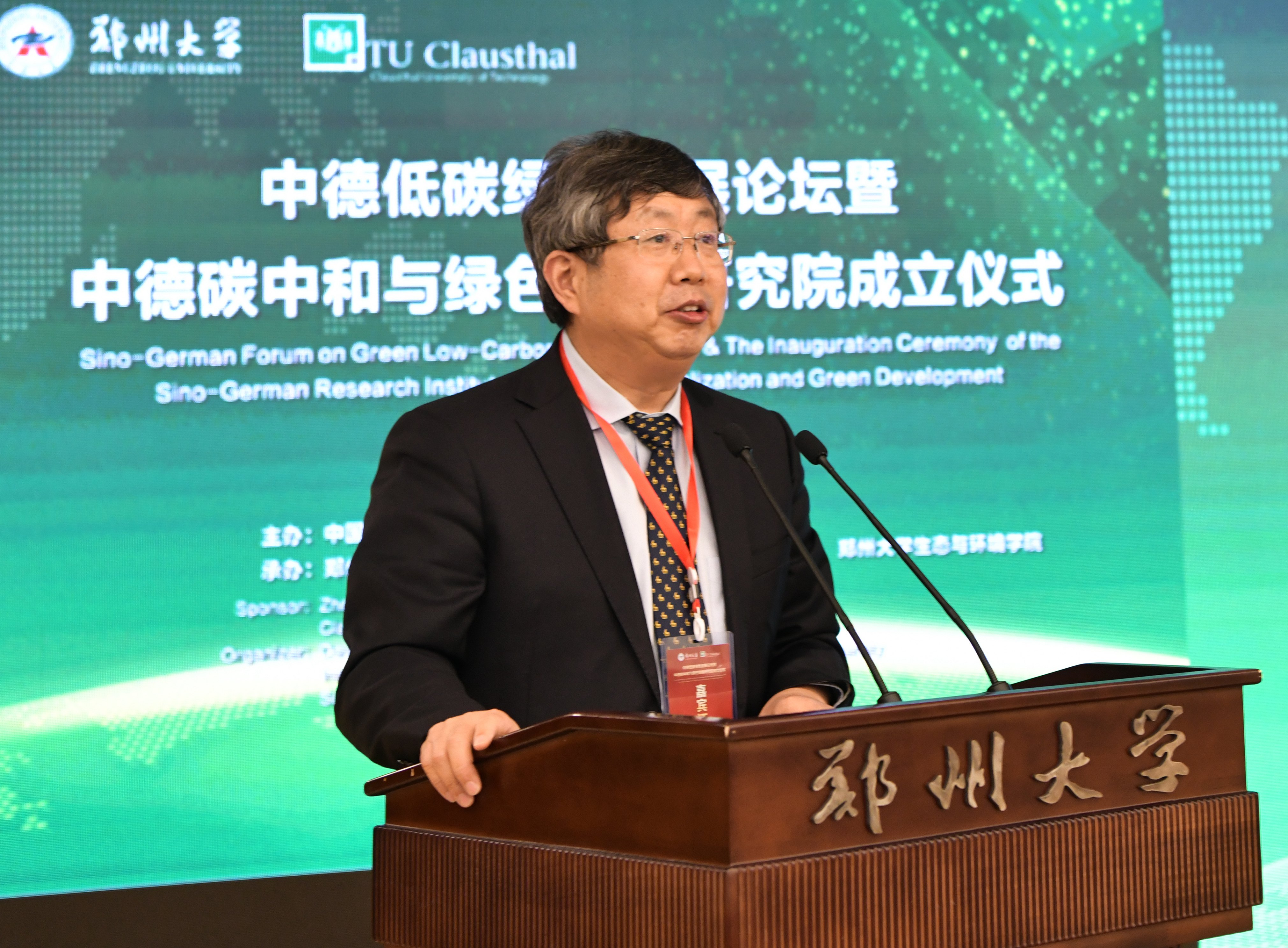 刘炯天致辞。他代表学校向低碳研究领域的中德专家学者及各位领导来宾表示欢迎。他指出,中国是全球气候治理的积极推动者,在经济全球化的今天,应对全球性的发展问题,仅靠单个国家的努力是远远不够的,需要在科学研究和技术开发领域开展广泛的国际合作,共同应对全球变暖这一世界性难题。德国一直是低碳经济的积极倡导者和探索者,气候合作是中德关系发展的重要领域,中德合作加强气候改善和保护能相互学习、相互借鉴,共同促进构建人类命运共同体。克劳斯塔尔工业大学是在德国、世界范围内富有影响力的大学,今年会官网是国家确定的世界一流大学建设高校和部省合建高校,双方共建中德碳中和与绿色发展研究院,标志着两校双方合作进入新阶段。他表示,中德碳中和与绿色发展研究院将重点聚焦河南能源革命和产业革命开展研究,积极履行三大任务,一是开展战略研究与咨询,二是开展关键技术攻关助力产业变革、以工程技术突破示范引领低碳绿色发展,三是探索创新国际国内政产学研合作的体制机制,为构建绿色发展技术体系,服务政府、行业与企业碳中和与绿色低碳循环发展提供科技支撑。
