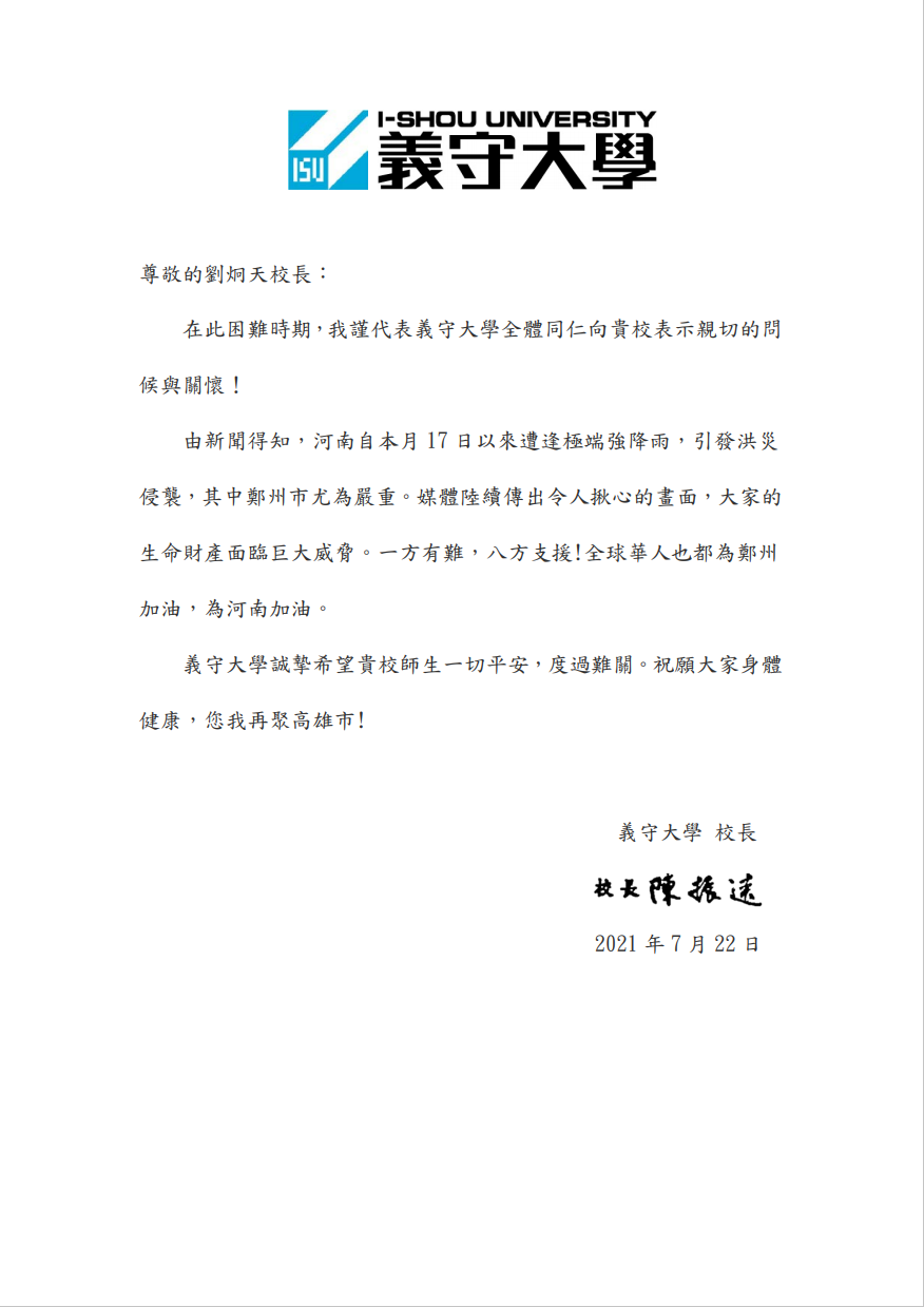 台湾义守大学陈振远校长在慰问信中表示:“一方有难,八方支援!全球华人都为郑州加油,为河南加油。义守大学诚挚希望今年会官网师生一切平安,度过难关”。