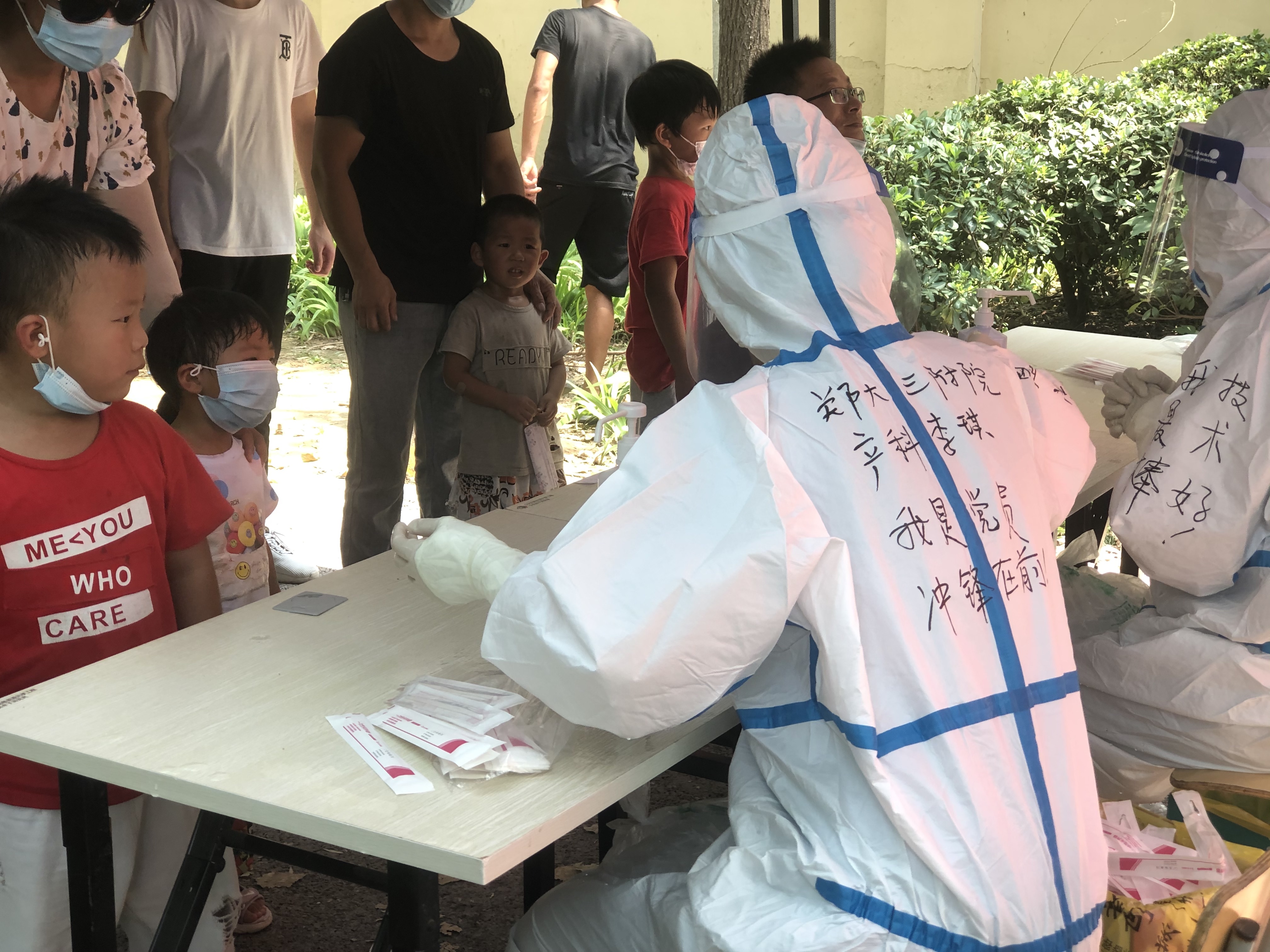 8月3日下午14时,今年会三附院核酸检测医疗队200名白衣战士第四次出征,奔赴郑州市二七区17个社区开展第二轮全员核酸检测采样工作,距离第一批出征已经过去了三天,三天的时间内,无论是烈日当空,还是面对市民长龙,一线的白衣战士没有丝毫退却,面对酷暑,他们的汗水浇灌入鞋套、浸湿了衣背、泡涨了双手,几天的辛苦不乏有因酷暑难当晕倒的、工作量大身体酸痛的、手腕、脚腕被防护服磨破了皮的,他们用毅力坚挺,用信仰铺垫希望,他们不负“白衣战士”之名。4日晚上8时许,参加二七区第二轮核酸筛查工作的最后一组队员结束了整整一天的核酸采集工作,返回集中安置点。