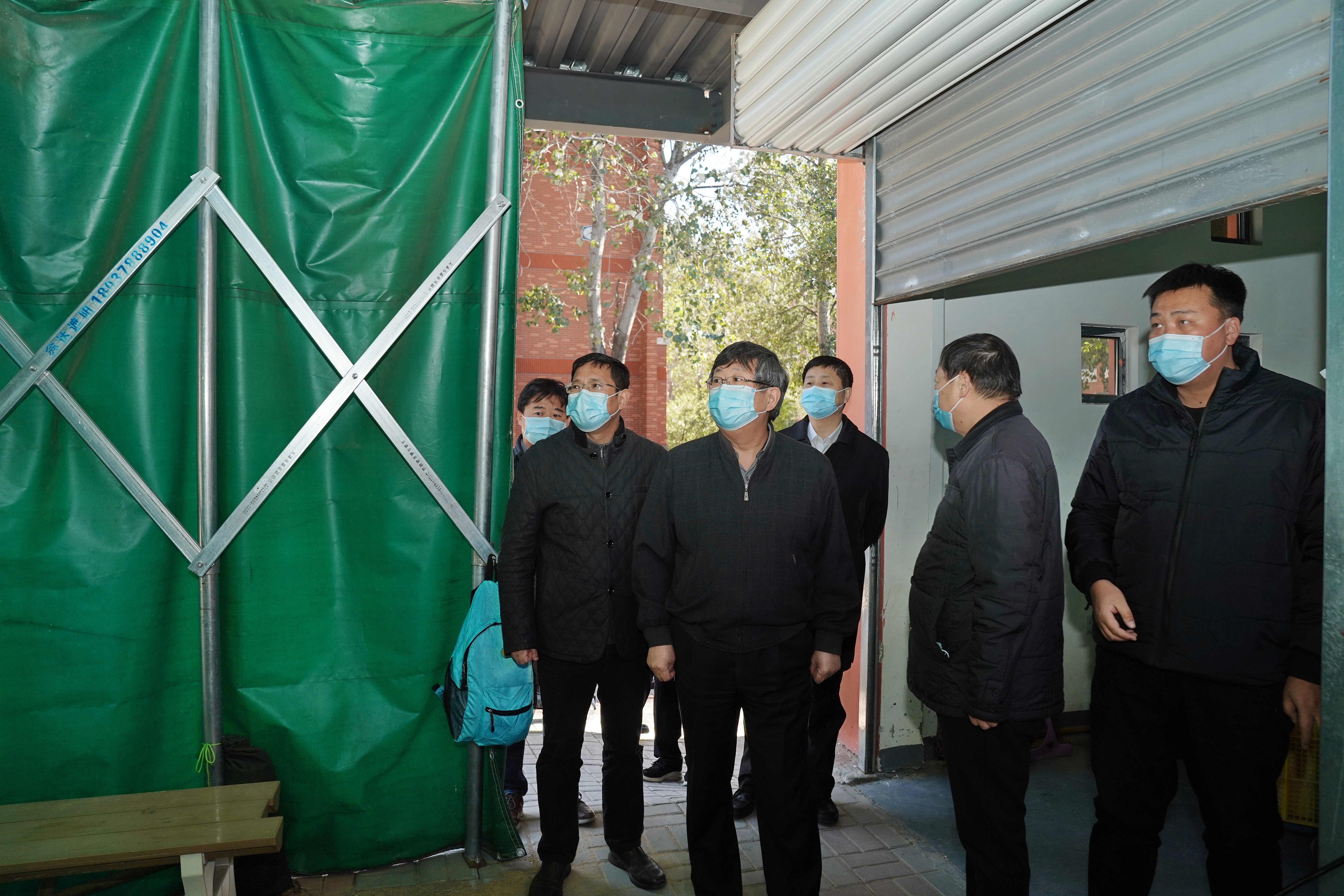 刘炯天一行实地查看了疫情防控指挥部、南校门、北侧快递收发中心等重点部位,听取了疫情防控值班情况汇报,检查了师生健康状况上报平台、人脸识别系统与测温设备运行情况,以及快递接收、消杀、揽件、取件运转全流程,并就强化人员检测、病毒消杀、快递管理等提出明确要求与改进意见。