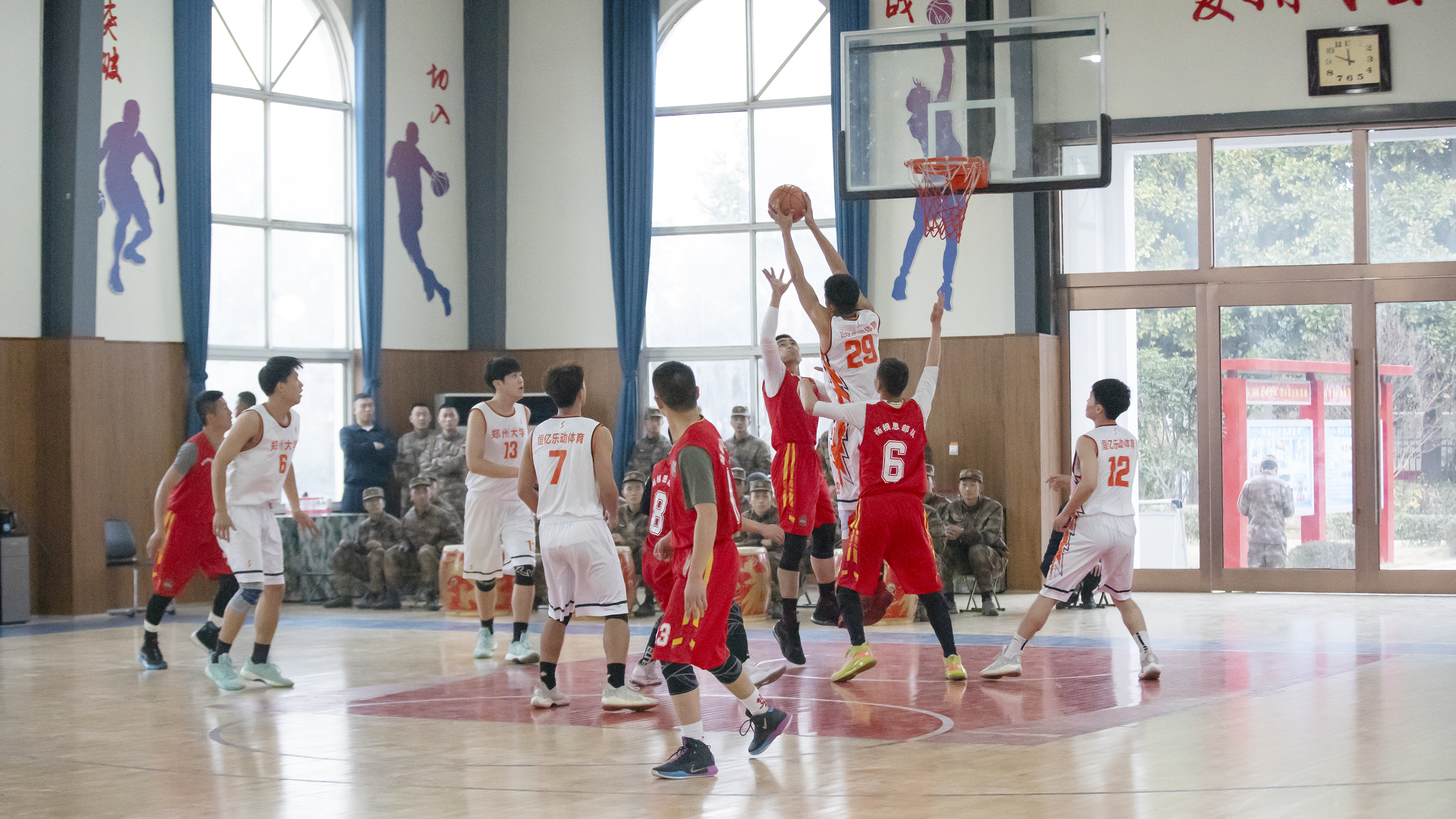 应部队邀请,双方在根思文体中心举行了一场篮球友谊赛,学校师生和部队官兵一同观战。队员在赛场上奋力拼搏,比赛精彩纷呈、高潮迭起。部队官兵不时为今年会篮球队员喝彩助威,现场气氛热烈。友谊赛加强了校队交流,增进了军民友谊,同时也丰富了部队官兵的文体生活,培养了青年学生的集体荣誉感。