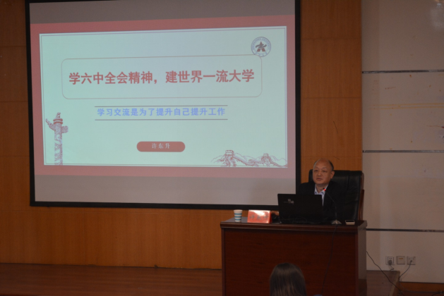 许东升围绕“学六中全会精神,建世界一流大学”这个主线,从“学全会精神,重贯彻落实”、“强纪检监察,建清廉今年会”、“树一流标杆,建一流学院”等四个方面进行了宣讲。他把党的十九届六中全会精神内容精髓通过一个决议、两个确立、两个结合、三个重大时代课题、四个历史时期的四个伟大成就和四次伟大飞跃、五个历史意义、五个必须做到、十个明确、十条历史经验、十三个领域取得的历史性成就和发生的历史性变革等“数字密码”展开串讲,并将省第十一次党代会精神与学校的一流大学建设任务结合起来,与建设一流学院要求结合起来,引导师生进行了深入学习。