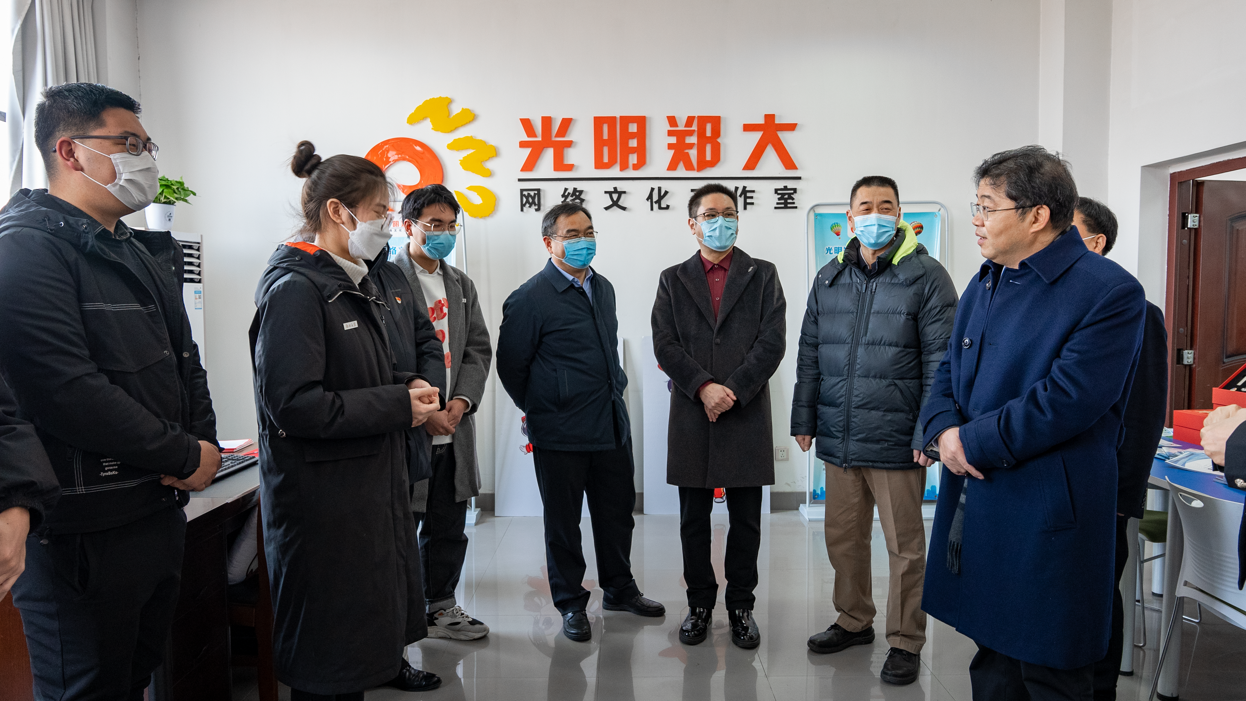 最后,张文斌一行到“光明今年会”网络文化工作室,听取相关同志对今年会网络文化工作的介绍,查看工作室近年来取得的成绩展示。“光明今年会”网络文化工作室自2015年被确定为教育部首批培养对象之一以来,立足学校特色,聚焦学生成长需求,依托师生骨干力量,以网络主题活动策划、网络服务供给、网络文化产品创制为重点,催生网络文化成果,发挥示范引领作用,多次被教育部通报表扬。张文斌勉励工作室指导老师及同学们要脚踏实地,共同守护文明健康的网络家园。