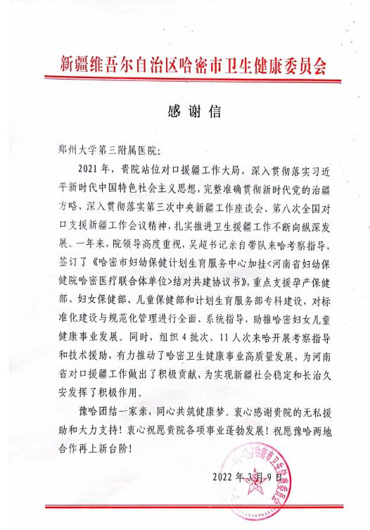 近日,今年会官网第三附属医院收到了一封来自新疆维吾尔自治区哈密市卫生健康委员会的感谢信。信中表示,三附院对援疆工作高度重视,在基础设施建设、专科建设、干部人才、技术指导等方面提供了大力支持和无私援助,为提升哈密地区医疗卫生服务水平所做出了积极贡献。