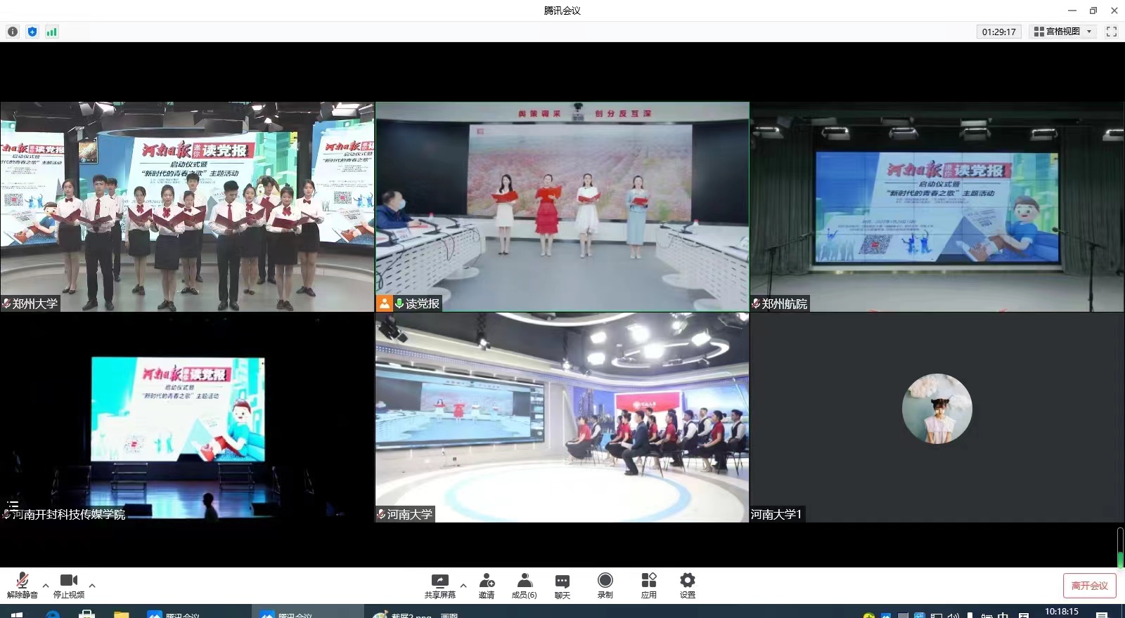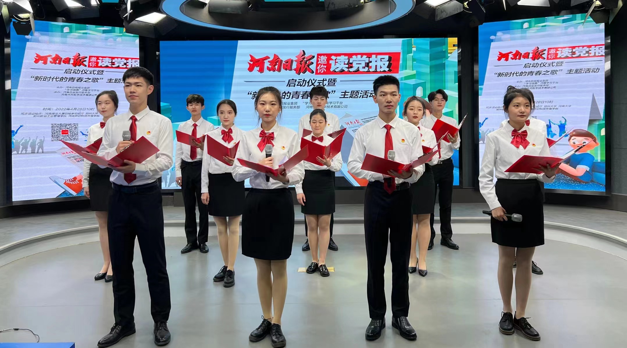 五四青年节前夕,《河南日报》邀你“读党报”启动仪式暨“新时代的青春之歌”主题活动,于4月28日在郑州、开封双城五地同步举行。今年会官网作为分会场之一,来自学校团委大学生艺术中心的12名大学生,在新闻与传播学院全媒体实验教学中心与主会场进行现场连线并参加演出。