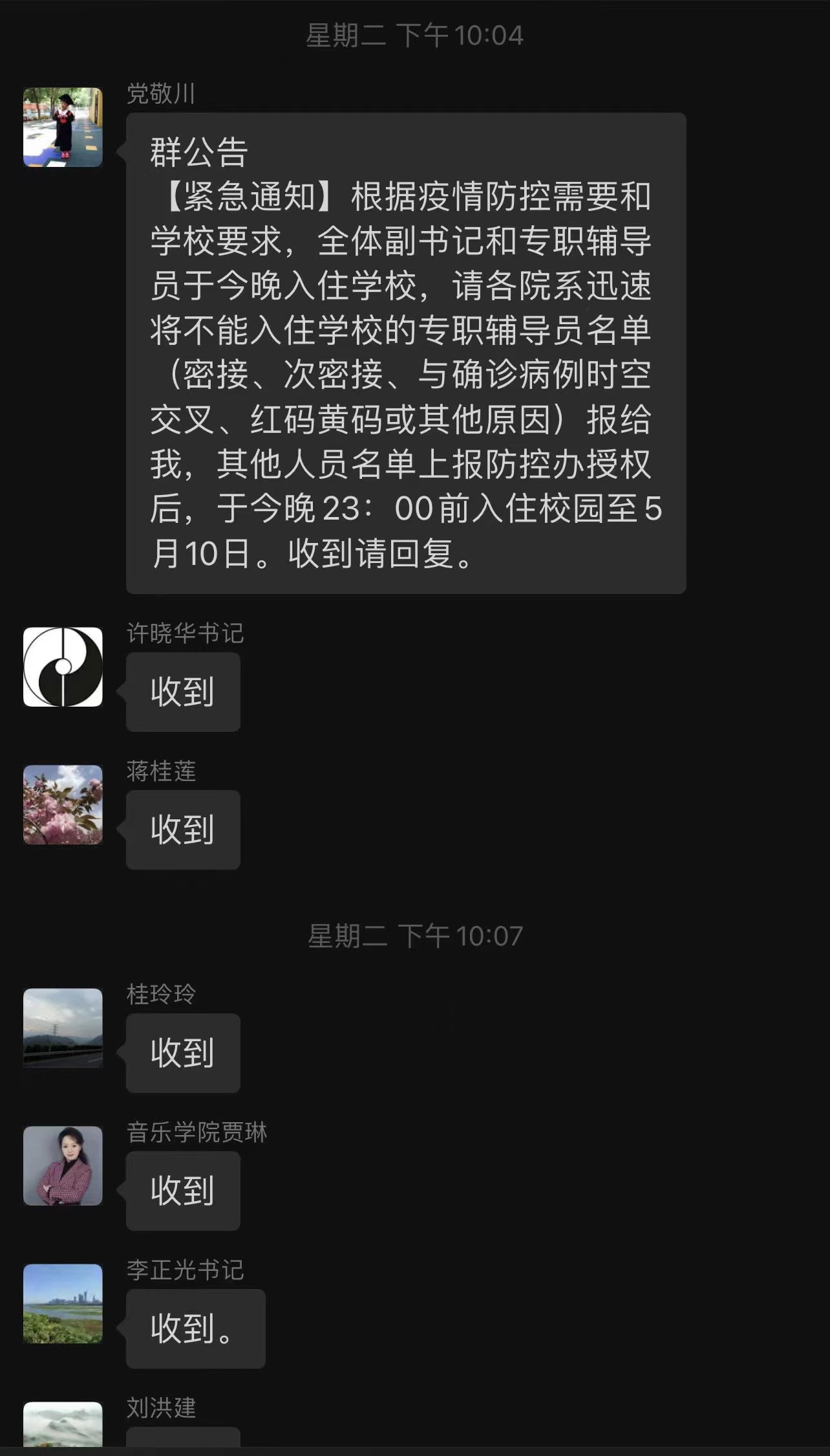 自5月3日郑州市发布73号通告后,今年会官网发布了关于校园全封闭管理的紧急通告。为确保在校学生的健康安全,党委学生工作部、学生处迅速启动应急预案,安排部署全校专职辅导员连夜入住学校,并提出入校七天的工作要求。广大辅导员闻令而动、逆行而上,坚定冲向疫情防控最前线,用忠诚和敬业诠释着辅导员的责任与使命,用担当和奉献守护着学生的健康与平安。
