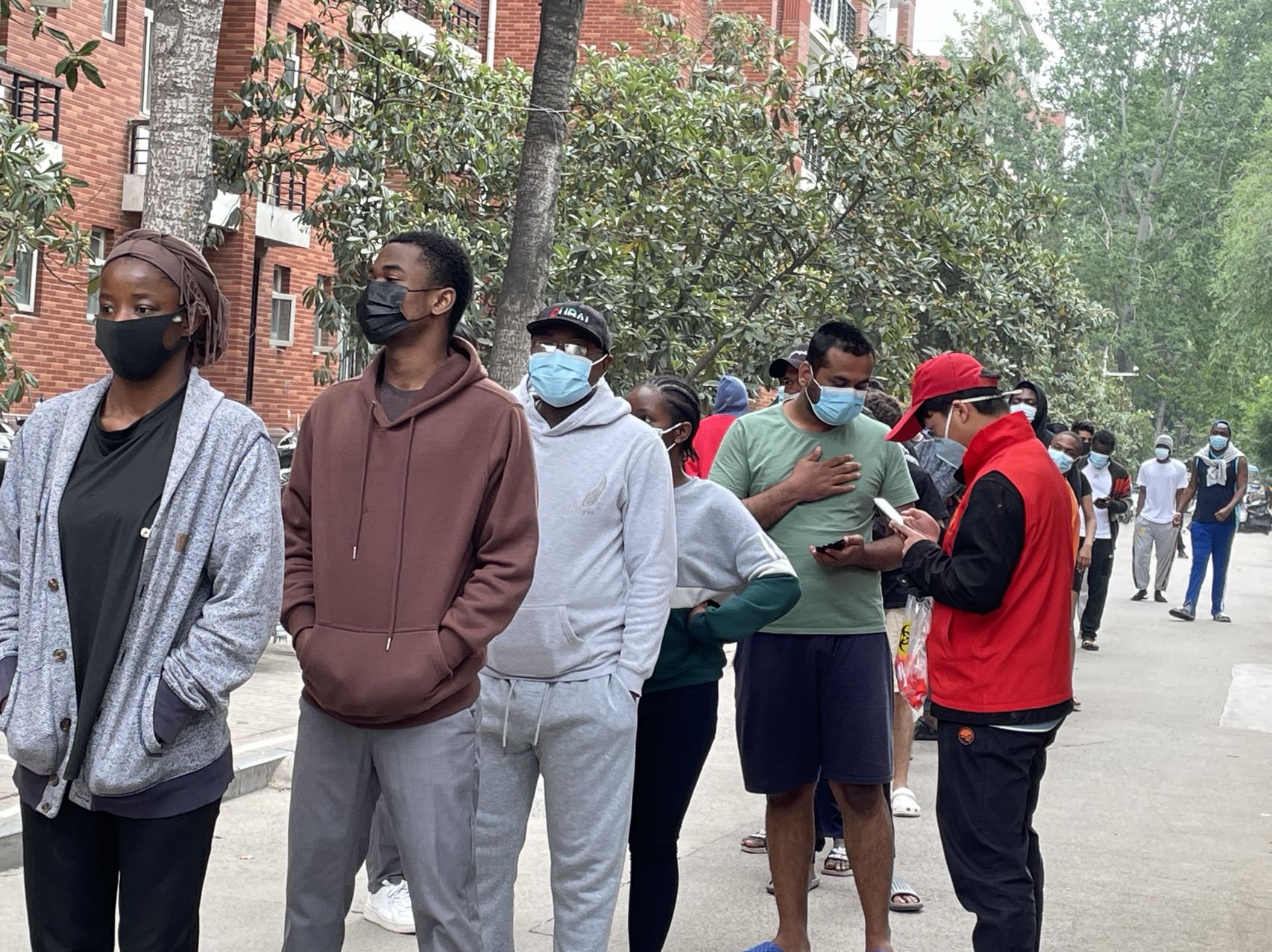 留学生在志愿者的协助下做核酸