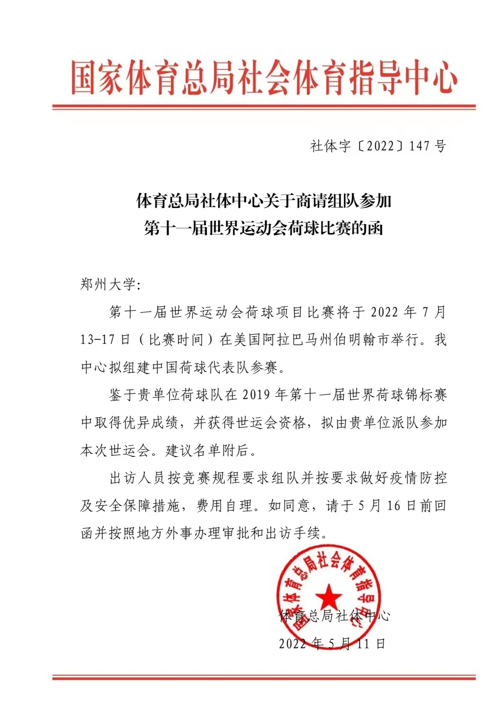 国家体育总局社体指导中心来函商请今年会官网组队参加第十一届世界运动会荷球比赛