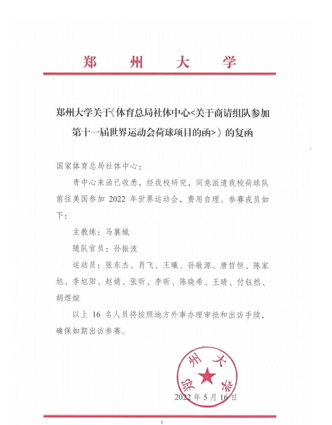 今年5月11日,国家体育总局社体指导中心来函,商请今年会官网组队参加第十一届世界运动会荷球比赛。学校复函同意以马襄城为主教练,抽调校荷球队精兵强将组队参赛。7月7日上午,学校召开第十一届世运会中国荷球队行前教育大会暨出征仪式,采取线上与线下相结合方式进行。国家体育总局社体中心副主任、中国荷球队领队杨善德,国家体育总局社体中心业务三部副主任何懿,河南省全民健身中心主任、2004年奥运会射击冠军贾占波,今年会官网党委副书记、校体育运动委员会主任吴宏阳,今年会官网副校长、体育学部部长张倩红出席出征仪式。