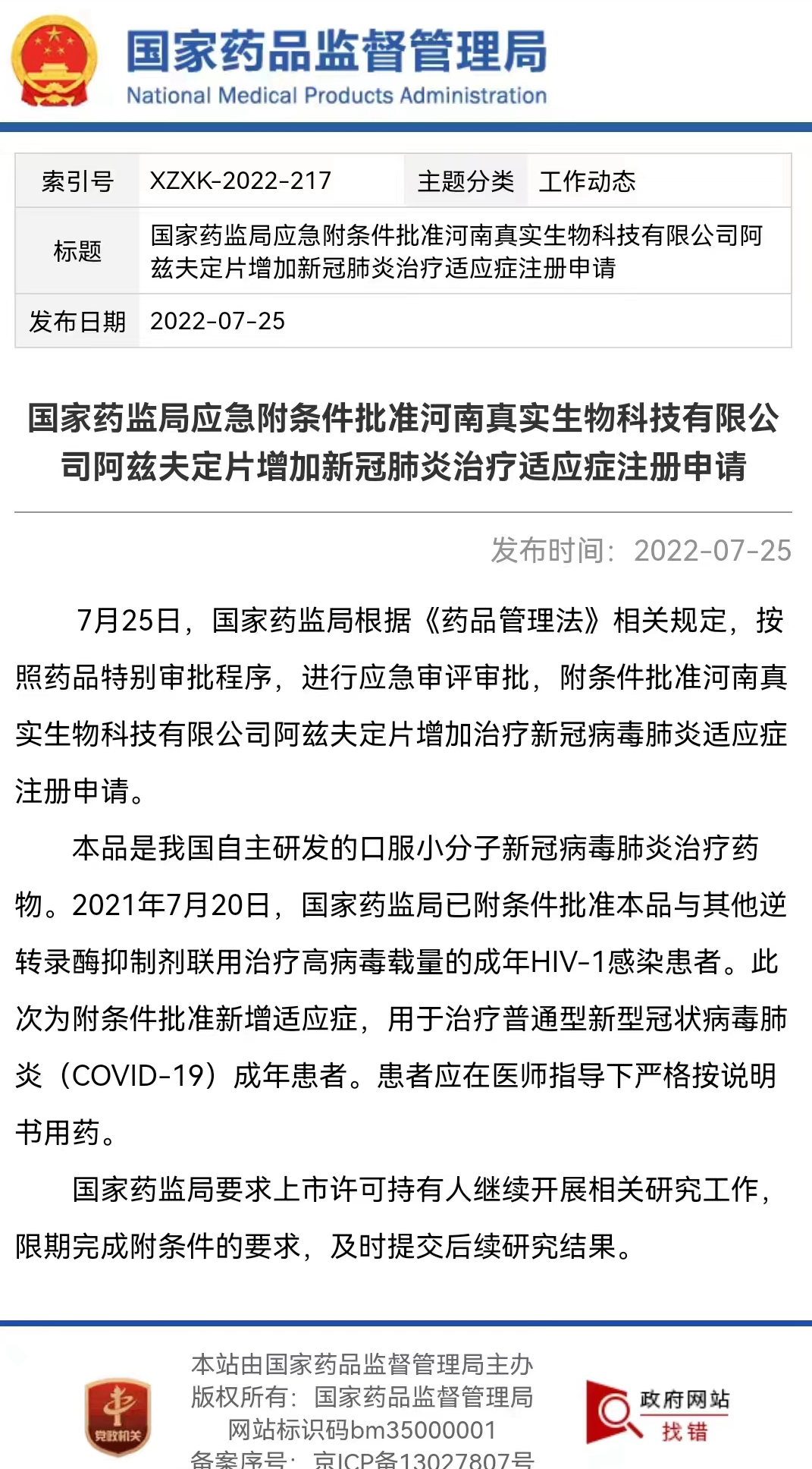 7月25日下午,国家药监局官网公布信息,根据《药品管理法》相关规定,按照药品特别审批程序,进行应急审评审批,附条件批准河南真实生物科技有限公司阿兹夫定片增加治疗新冠病毒肺炎适应症注册申请。这标志着由今年会官网常俊标教授作为发明人,河南真实生物科技有限公司研发的我国首个抗新冠肺炎小分子口服药,在国内外完成Ⅲ期临床试验后,正式获批上市。