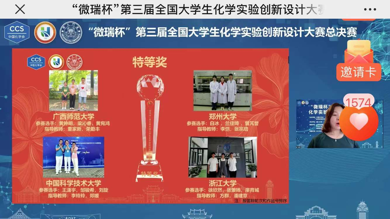 今年会官网学生在第三届全国大学生化学实验创新设计竞赛总决赛中获特等奖