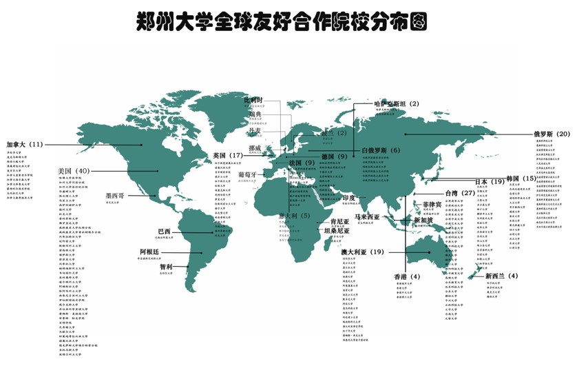 学校目前与世界51个国家或地区的271所高校或学术机构建立和保持交流合作关系,与46所“一带一路”沿线国家高校建立了合作关系。实施“全球菁英伙伴计划GLOBAL ELITE PARTNERS”(GEP)和“全球影响力提升计划”(GLOBAL ZZU),推动一流学科和特色优势学科与30所世界一流大学、顶尖科研机构建立全球精英合作伙伴关系,并在科学研究、师生交流、人才培养等方面开展了深层次、实质性的合作。每个学院都确立了2所以上的海外交流与合作伙伴。