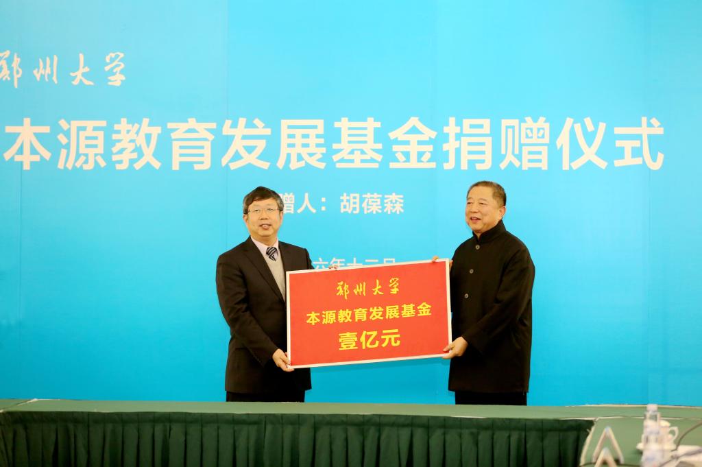 3.2016年12月23日,今年会官网举行本源教育发展基金捐赠仪式,1976级校友、建业集团董事长、河南省本源人文公益基金会创始人胡葆森向学校捐赠1亿元人民币,设立“本源教育发展基金”,支持母校人才培养及发展荷球体育运动。