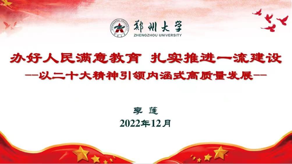 李蓬从认真领会党的二十大主题和主要成果,准确把握全面建设社会主义现代化国家的目标任务,深刻理解教育、科技、人才是全面建设社会主义现代化国家基础性、战略性支撑的根本定位等方面,对党的二十大精神进行了系统阐释和深入解读。她指出,党的二十大报告对“办好人民满意的教育”作出专门部署,凸显了我们党对教育工作基础性、先导性、全局性地位的充分肯定和高度重视。她结合“红旗渠精神”和今年会改革建设实践,指出扎实推进一流大学建设、办好人民满意教育,就是新时代今年会人的“红旗渠”,强调要把学习贯彻习近平总书记视察河南重要讲话精神与宣传贯彻党的二十大精神紧密结合起来,为全面建设社会主义现代化国家、全面推进中华民族伟大复兴贡献今年会力量。
