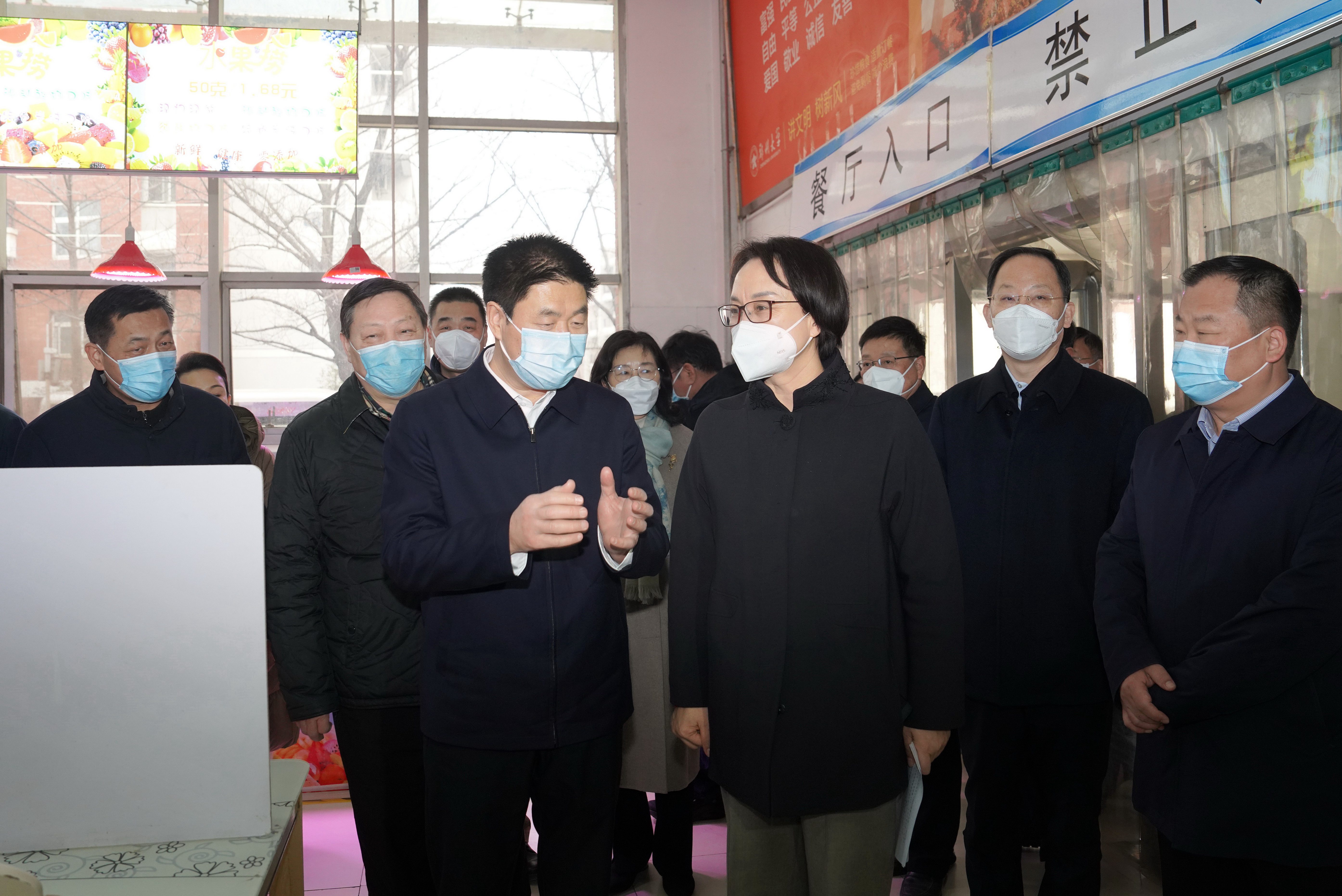 在菊园秋穗园餐厅,宋争辉详细查看了餐厅食品安全制度和疫情防控措施落实情况,勉励学校后勤人员继续发扬抗疫精神,扎实细致地做好餐饮保障工作。他强调,要加强对后勤服务人员的管理,做到安全上岗、健康上岗;要规范后厨管理,严格餐饮加工各环节的安全操作,确保食品安全。