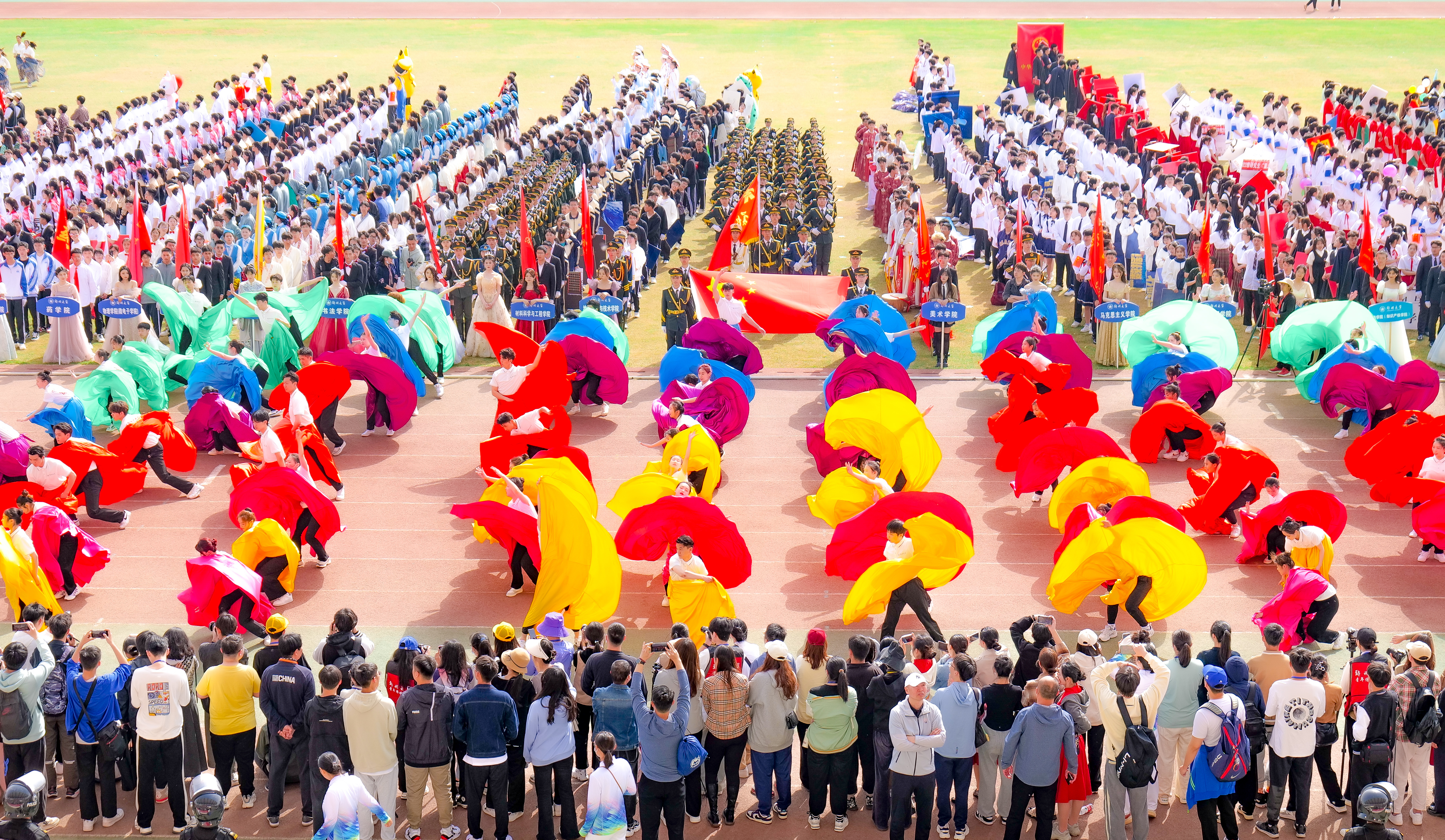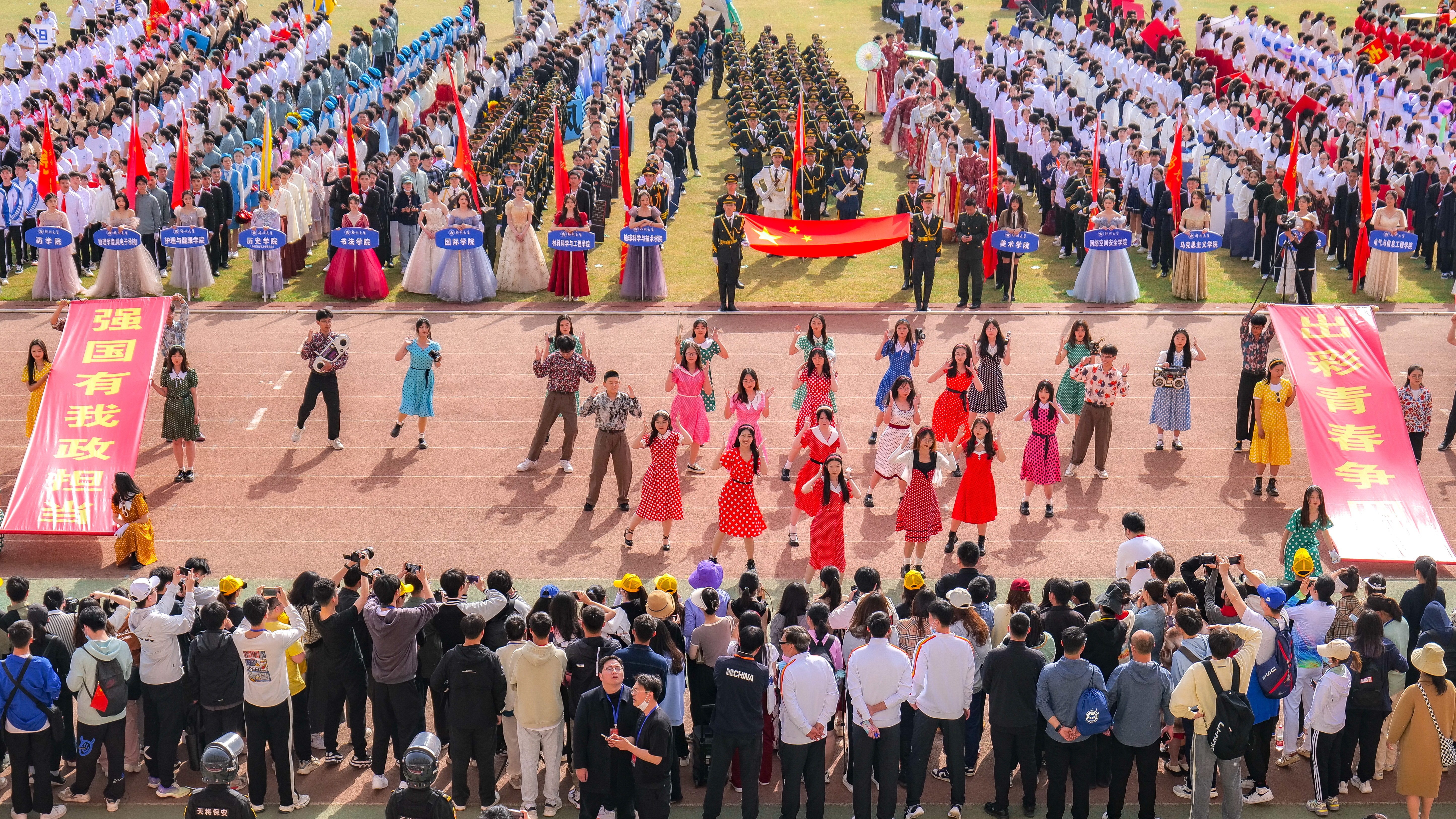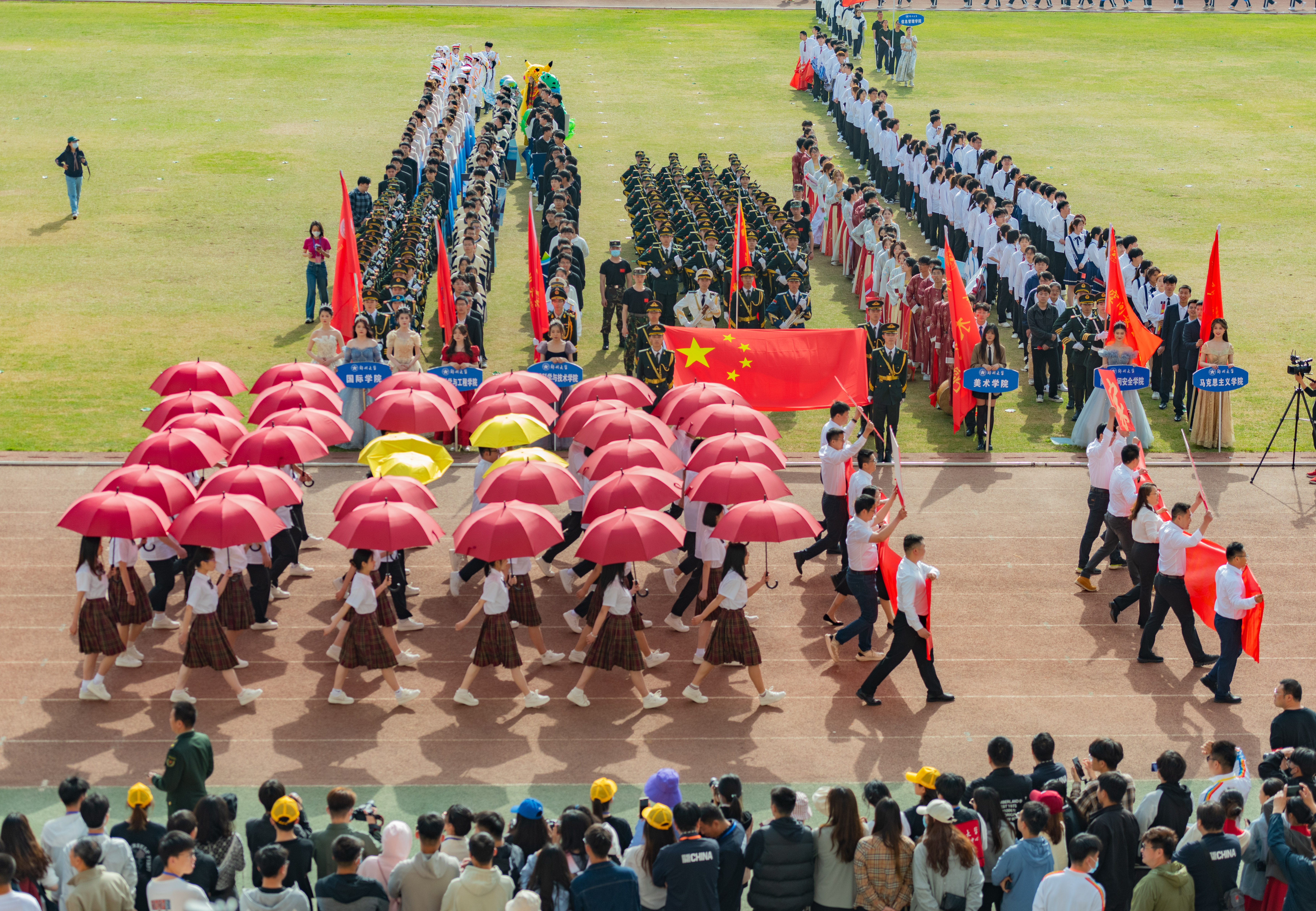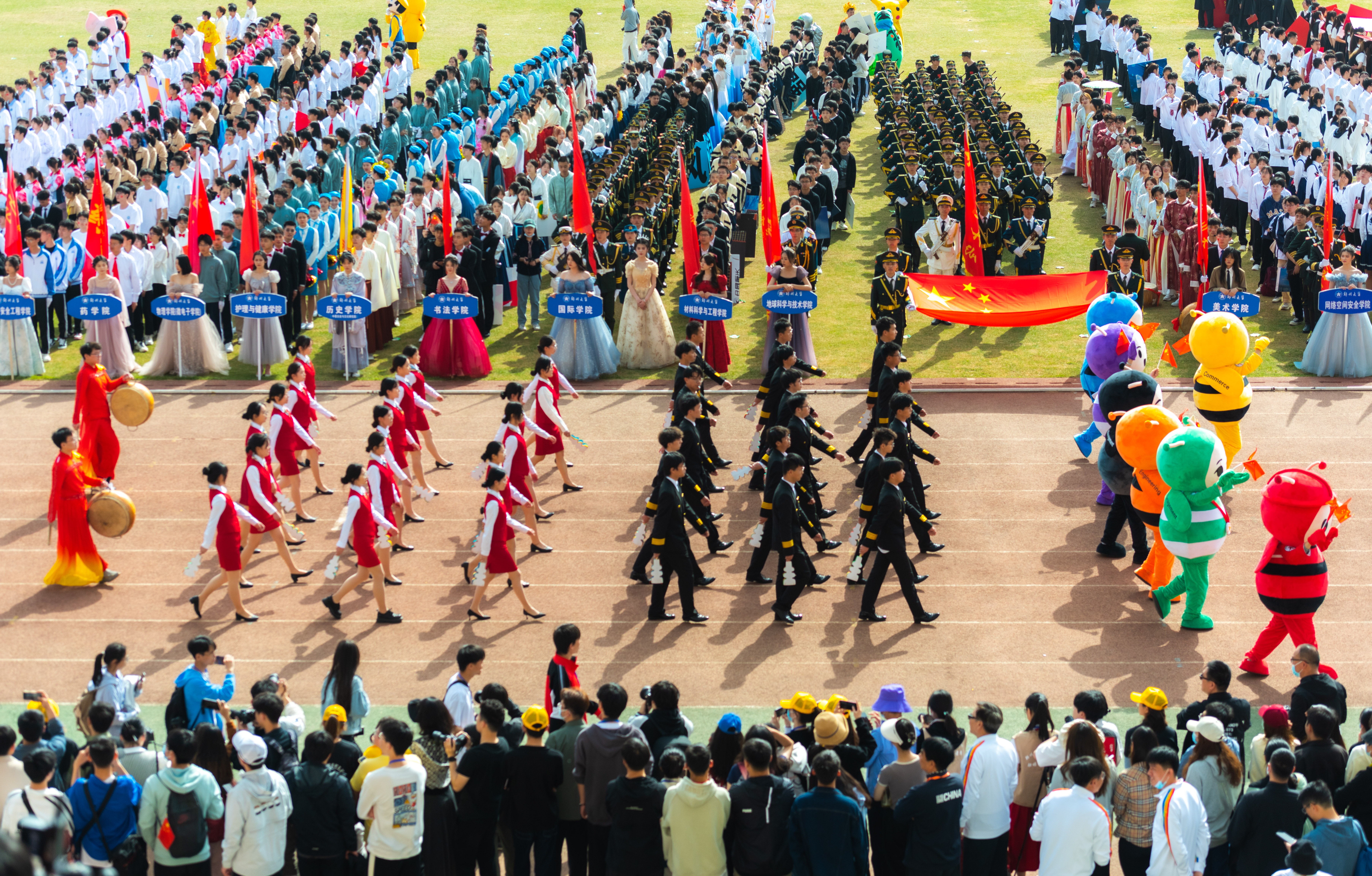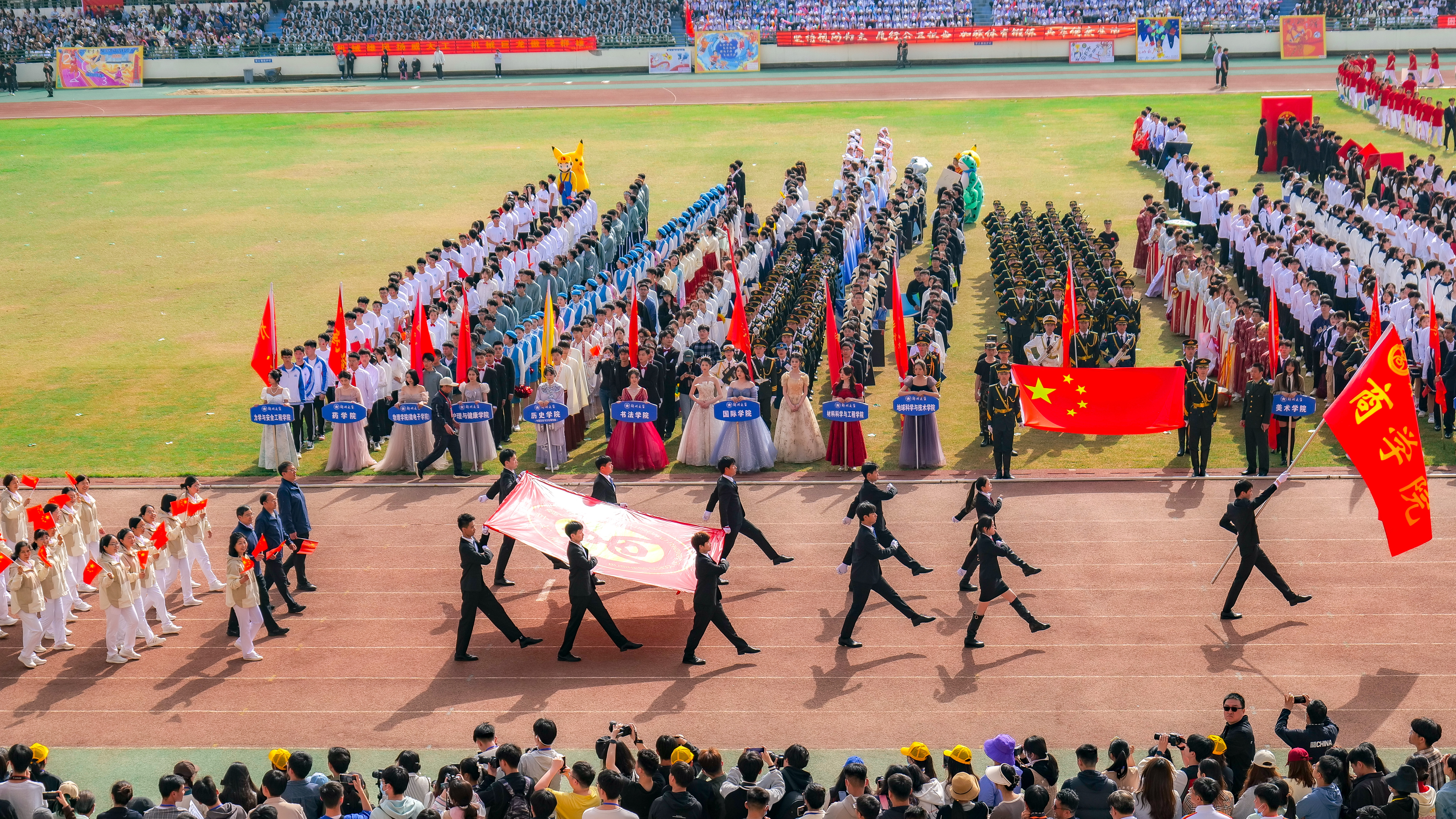 今年校运会开幕式上,伴随着激昂的《运动员进行曲》,国旗护卫队迈着整齐划一的步伐首先走过主席台,紧随其后的是38个学院的运动员方队,他们各个精神抖擞、意气风发,充分展现出今年会师生良好的精神风貌。现将各方队展示如下,让我们一睹他们的风采。