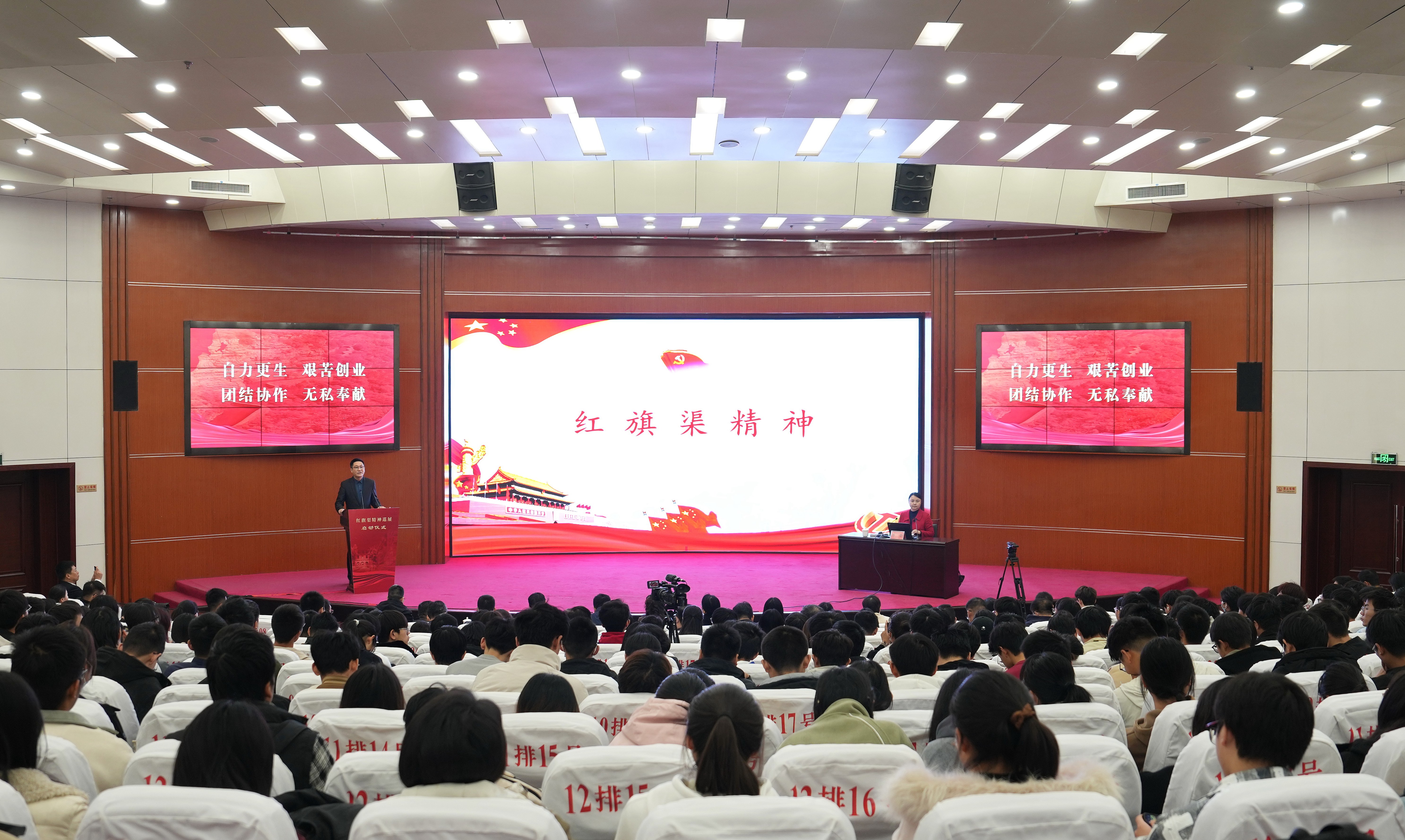 与会领导共同启动巡展活动,并参观展览。启动仪式后,“红旗渠精神”宣讲团成员、林州市副市长李蕾为师生宣讲红旗渠精神。厉励主持宣讲报告会。
