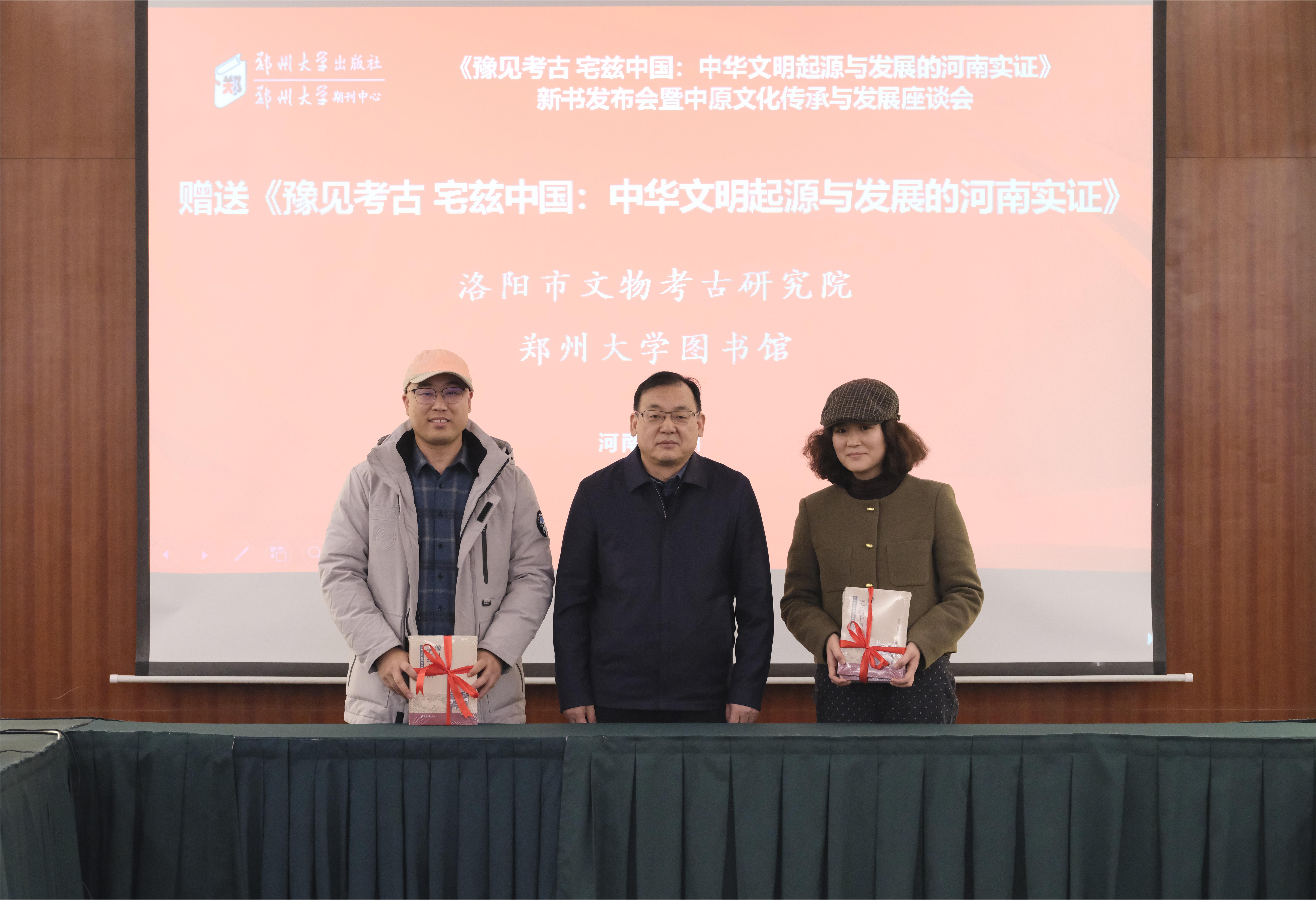 与会领导和嘉宾共同为《豫见考古 宅兹中国:中华文明起源与发展的河南实证》首发揭幕,并向河南省文物局等10家单位捐赠新书。