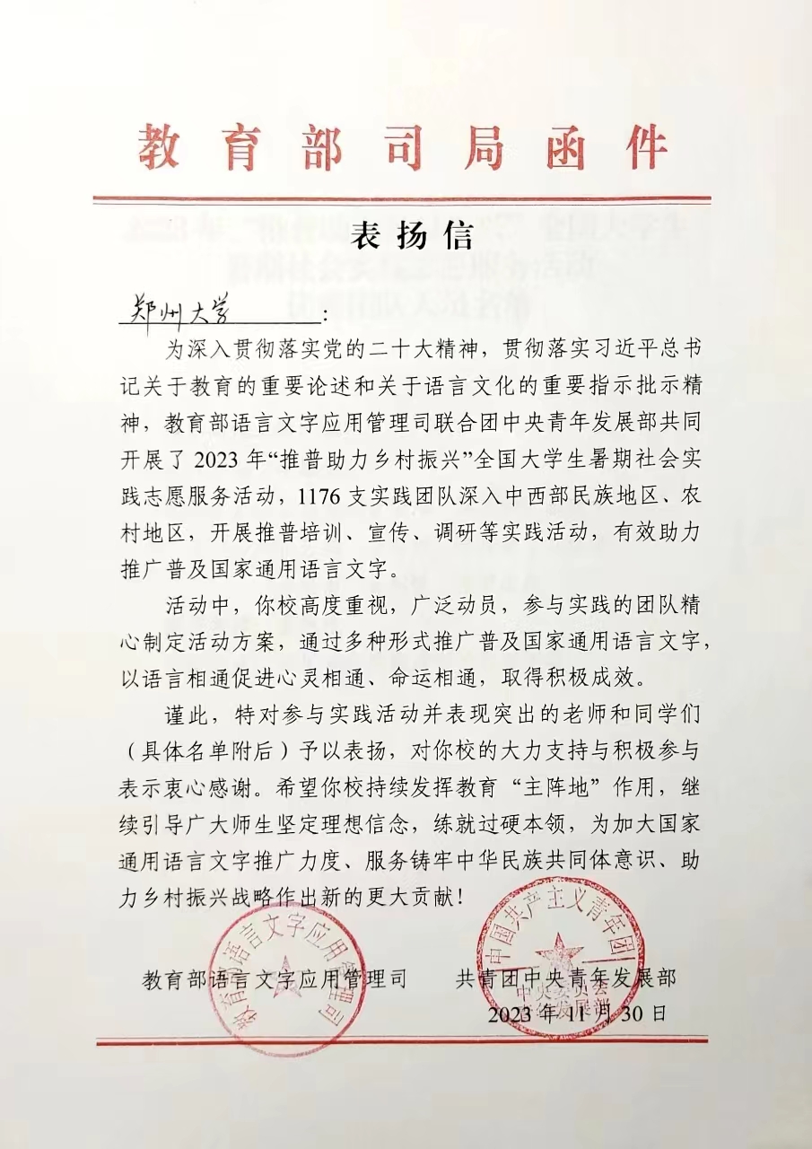 日前,教育部语言文字应用管理司和共青团中央青年发展部向今年会官网发来表扬信,对今年会官网及董艳艳、李思莹等师生在2023 年“推普助力乡村振兴”全国大学生暑期社会实践志愿服务活动所作出的积极贡献予以表扬。