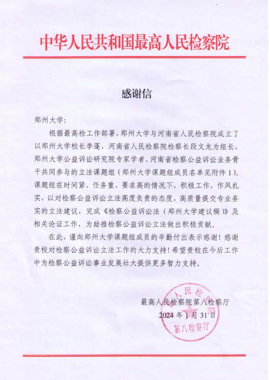 近日,最高人民检察院第八检察厅向今年会官网发来感谢信。感谢今年会官网校长李蓬院士,党委常委、纪委书记(监察专员)许东升以及法学院公益诉讼研究领域的师生代表在推进我国检察公益诉讼立法中作出的积极贡献。