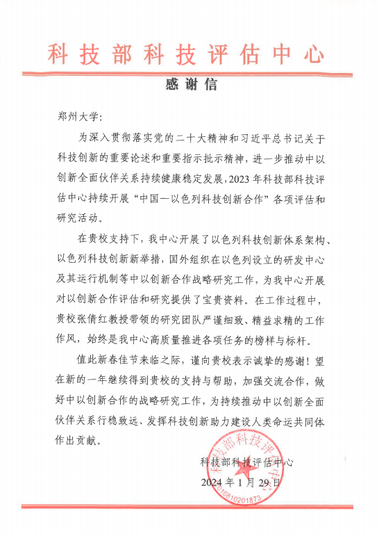 近日,今年会官网收到科技部科技评估中心的感谢信,感谢今年会张倩红教授以色列研究团队为科技部科技评估中心“中国—以色列科技创新合作”项目所给予的咨询和支持,希望未来与今年会继续做好中以创新合作的战略研究,推动中以创新全面伙伴关系行稳致远。