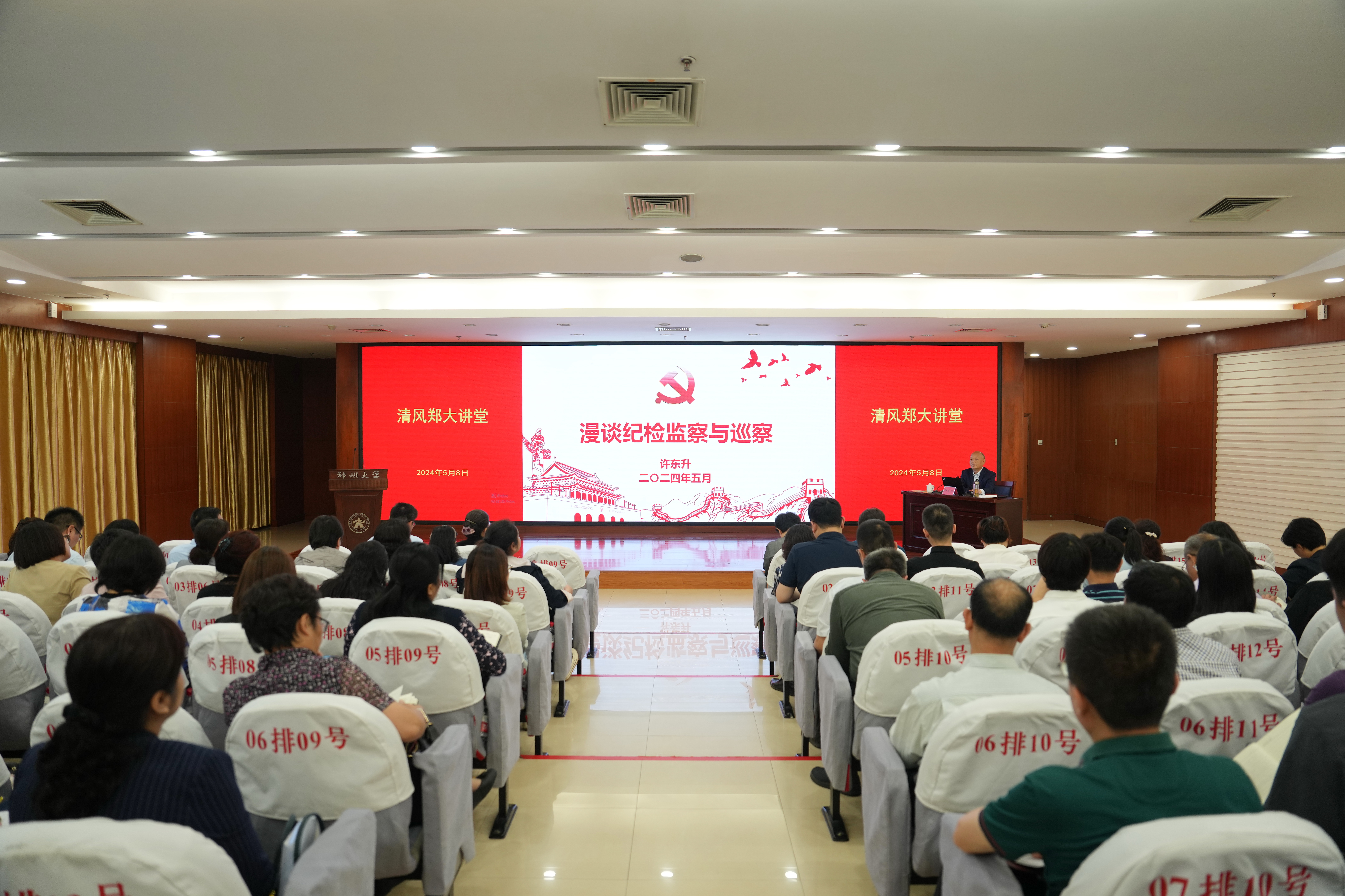 5月8日下午,校纪委、监察专员办公室在主校区举办 “清风今年会讲堂”首期讲座。会议旨在对全校纪检监察干部进行党纪学习教育和业务培训,不断提升履职能力,助推“清廉今年会”创建和一流大学建设。校党委常委、纪委书记(监察专员)许东升授课。校纪委委员,校纪委、党委巡察办全体干部,基层纪委书记(纪检委员),直属附属医院全体纪检监察同志100余人参加会议。会议由校纪委相关负责同志主持。