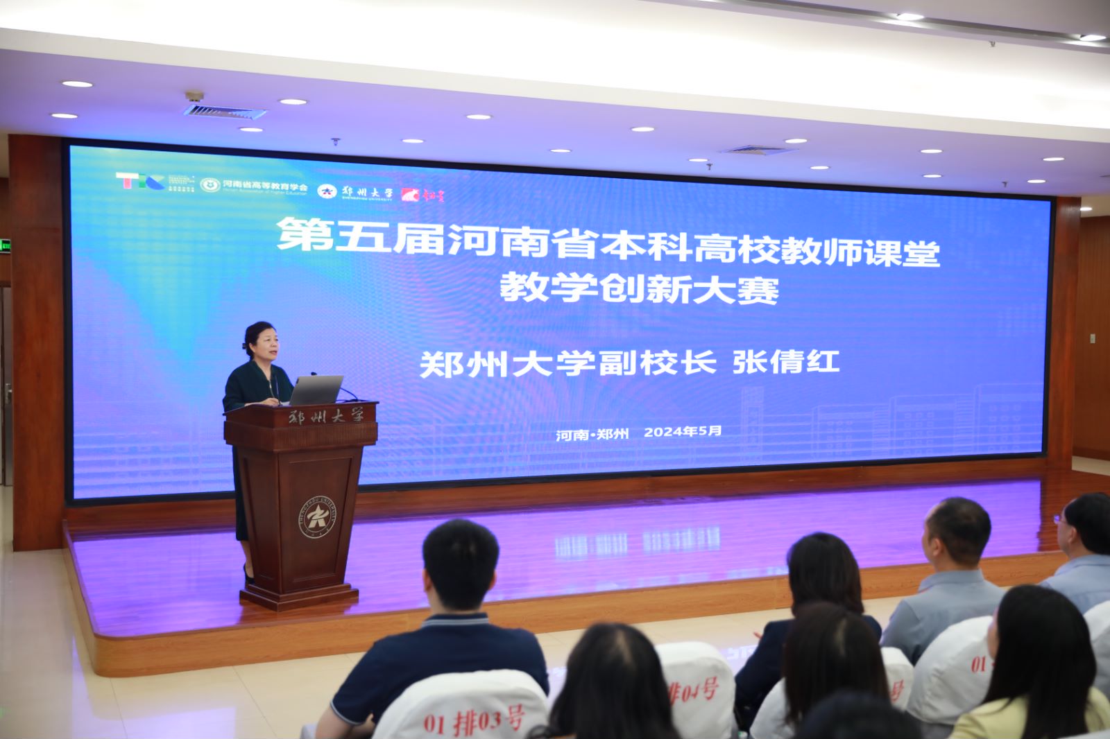 张倩红致辞。她表示,教学创新是推动教育发展的动力,本次大赛各位参赛教师展示了自己的教学创新成果,交流了创新经验,提高了教育教学水平,实现了以赛促教、以赛促学、以赛促改、以赛促建、以赛促创的目标。她希望各位老师在未来的工作中持续更新教育理念、掌握现代教学方法、提高育人实践能力,不断提升人才培养质量,为我省高等教育事业的发展做出更多、更大贡献。