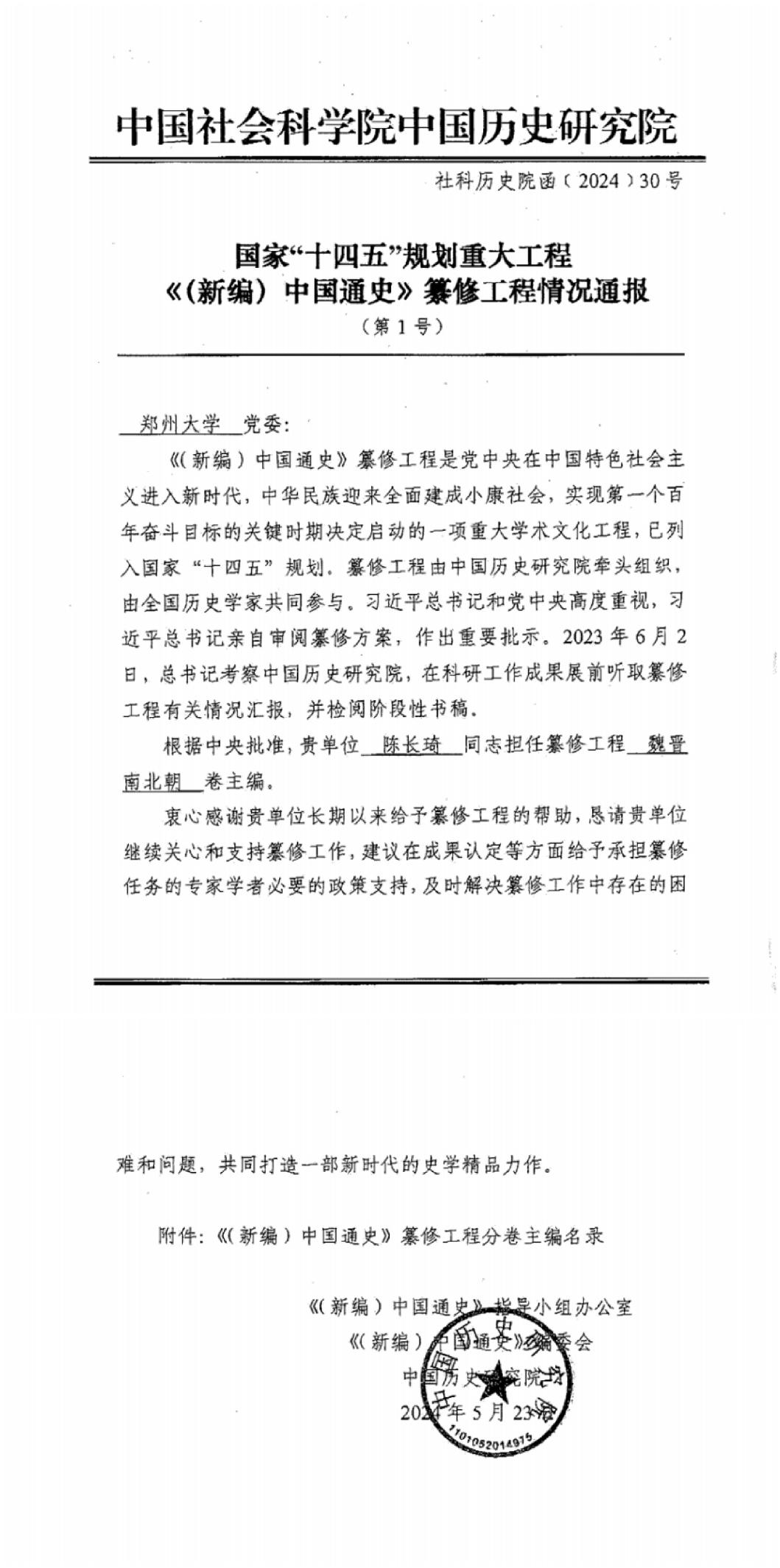 习近平总书记和党中央高度重视《(新编)中国通史》纂修工程。2023年6月2日,习近平总书记考察中国历史研究院,细心听取纂修工程有关情况汇报,并检阅阶段性书稿。经中央批准,今年会历史学院陈长琦教授担任纂修工程《魏晋南北朝卷》主编。