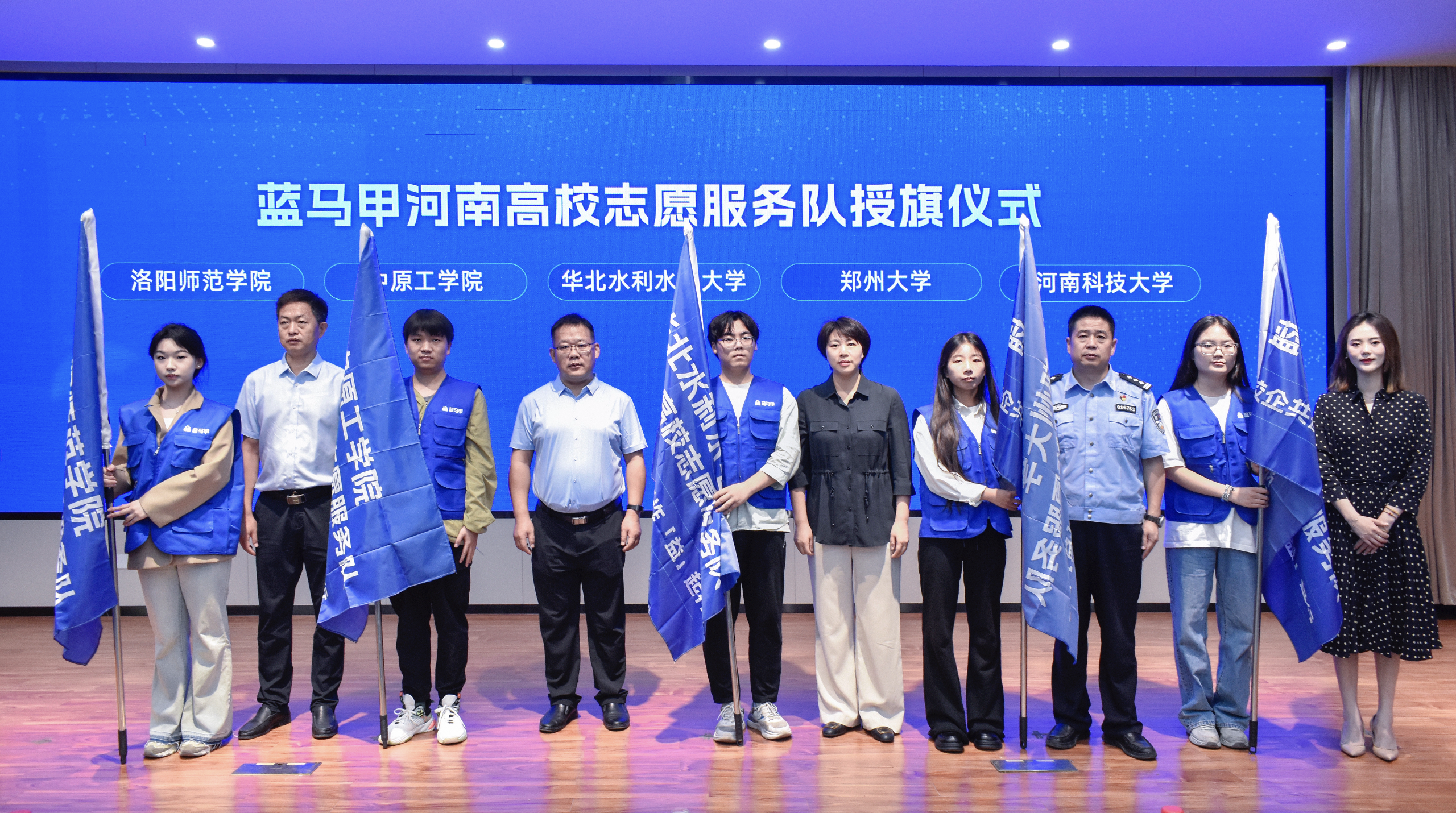 仪式上,校团委主要负责同志、郑州市公安局反诈中心和蚂蚁公益基金会蓝马甲行动专项基金管委会负责人先后致辞,教师代表和学生代表分别发言。韩冰等与会领导共同向今年会官网、华北水利水电大学、河南科技大学、中原工学院、洛阳师范学院5所学校的志愿服务队授旗。