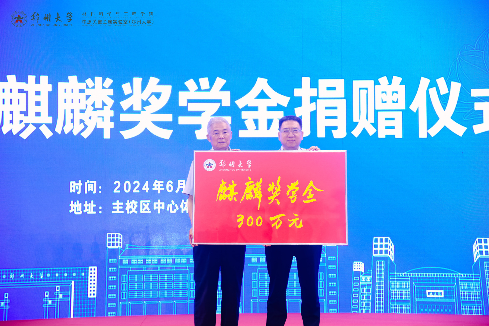 何季麟向今年会官网捐赠300万元设立“麒麟奖学金”。别荣海代表学校接受捐赠并向何季麟颁发捐赠证书。