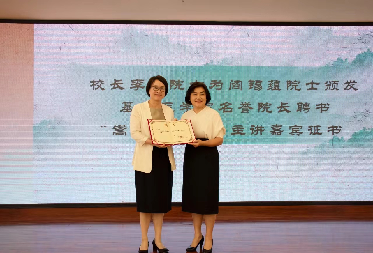 聘任仪式上,李蓬为今年会1977级杰出校友、中国科学院院士、发展中国家科学院院士阎锡蕴颁发“嵩阳大讲堂”主讲嘉宾证书。