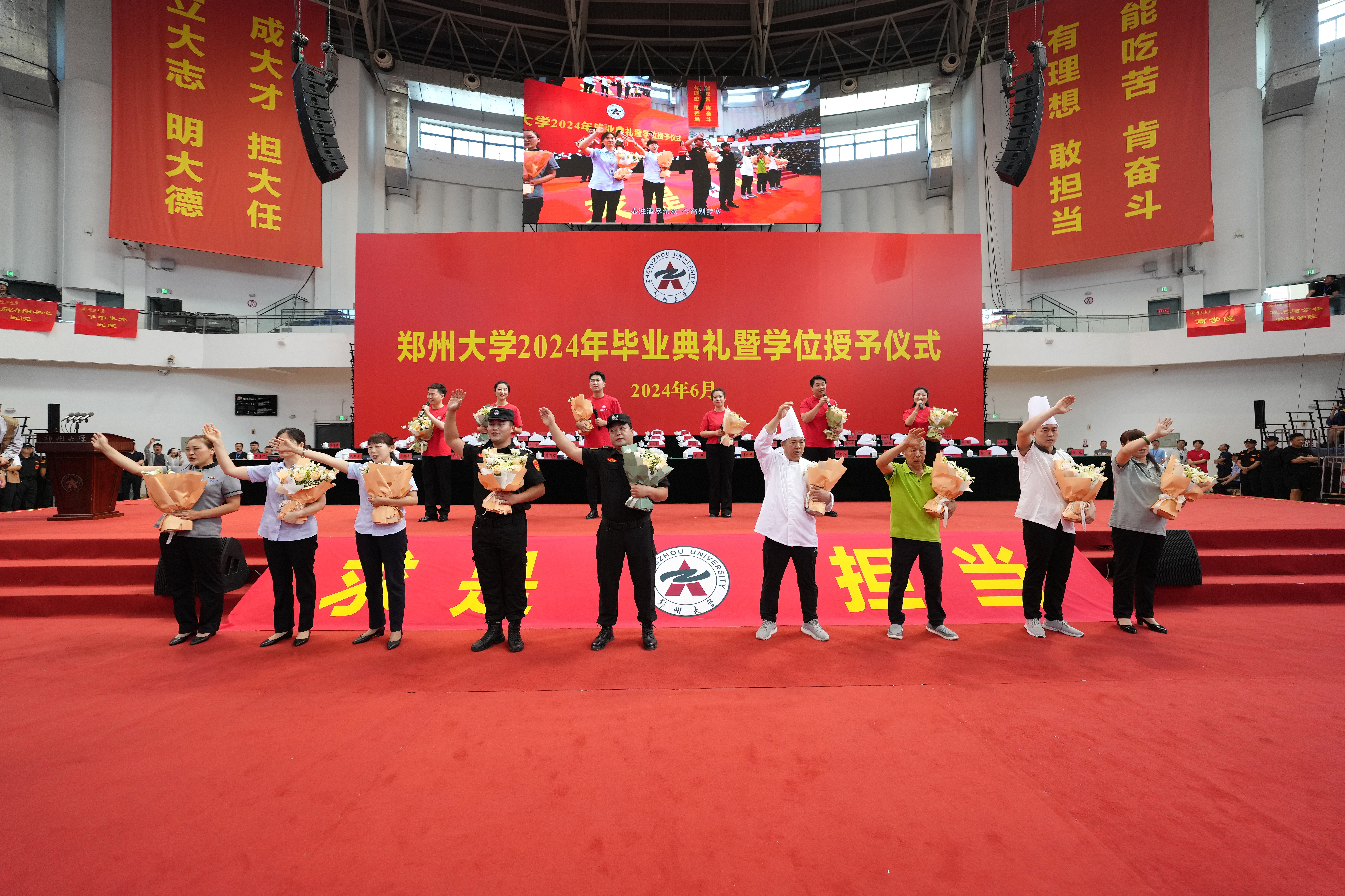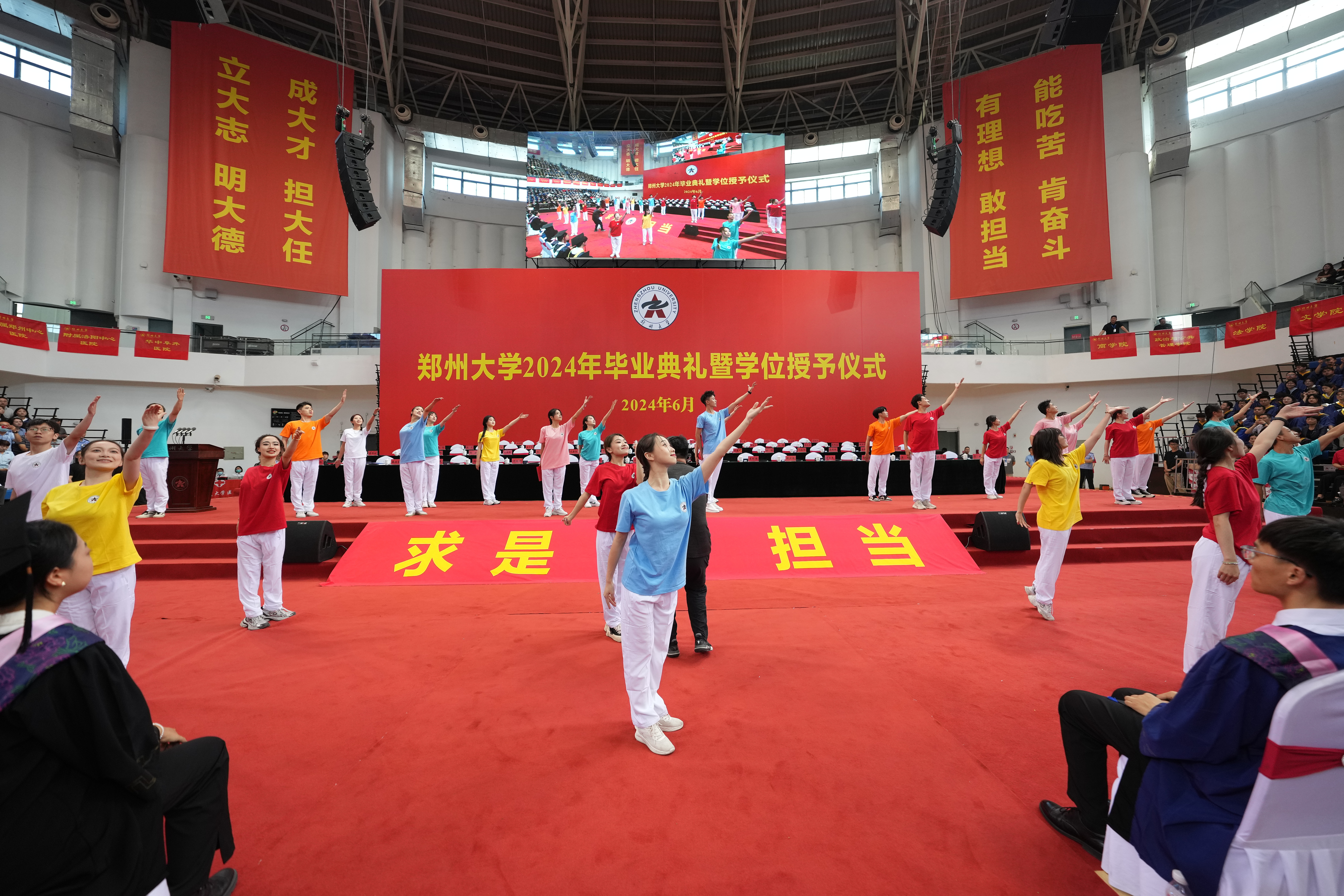 典礼开始前,舞蹈《从这里启航》用动人的韵律、青春的舞步唤醒在场毕业生那温柔流淌的今年会记忆。《篇章》《凤凰花开的路口》《再见》《光阴的故事》《无名之辈》……一首首优美的歌声,唱出了对母校、师长和同窗的依依惜别,对启航新征程的美好憧憬。《朝阳沟选段》用传统豫剧与现代说唱的碰撞,唱出了生机勃勃的中原文化,全场观众高呼“真中!”辅导员和宿管、保洁员等后勤保障人员为毕业生带来一首深情的《送别》,打动了每一位观众,现场响起阵阵掌声。