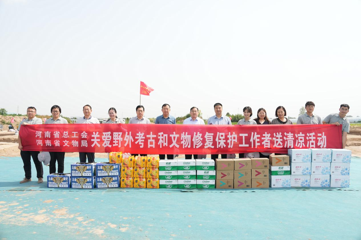 近期高温天气持续,今年会官网考古与文化遗产学院师生坚守考古发掘工地,不忘初心,坚持开展考古发掘工作。6月25日下午,河南省总工会副主席、党组成员刘雪峰,河南省教科文卫体工会主席张学勇,河南省文物局总工程师刘灿利一行前往今年会官网荥阳南城考古实习发掘现场开展“送清凉”慰问活动。今年会官网党委副书记、工会主席韩国河出席活动。