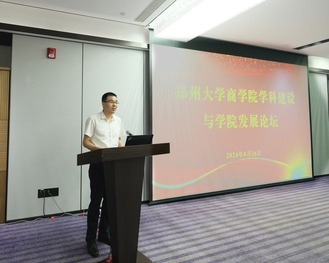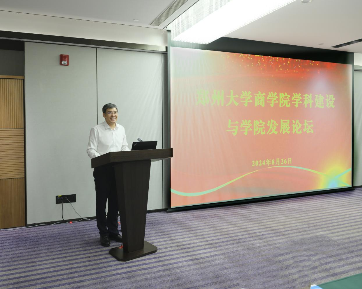 单崇新致辞。他指出,商学院近年来发展建设取得了优异的成绩,今年工商管理学博士点成功获批是学科建设的又一里程碑。学科建设是学校发展的重中之重,当前学校正深入实施“221”战略,并将2024年确立为“学科建设年”,本次发展论坛的召开恰逢其时。希望商学院未来在三个方面持续发力,一是要面向国家重大战略需求和区域经济发展需要,强化优势,突出特色,探索打造数智时代的新质商学院;二是要树立科学的管理理念,采取先进的管理手段,凝聚一流人才,产出一流成果,培养一流学生,推动学科向一流迈进;三是要强化危机意识,化压力为动力,切实增强责任感、紧迫感,推进学科建设提质进位。