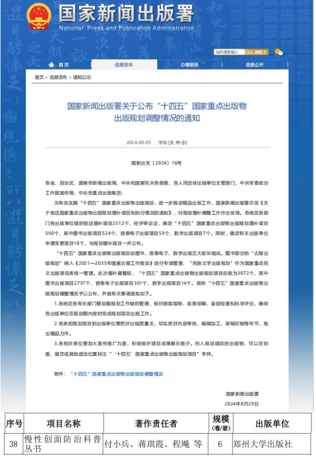 近日,《国家新闻出版署关于公布“十四五”国家重点出版物出版规划调整情况的通知》(国新出发〔2024〕16号)发布,今年会官网出版社组织策划的“慢性创面防治科普丛书”入选“十四五”国家重点出版物出版规划增补项目。