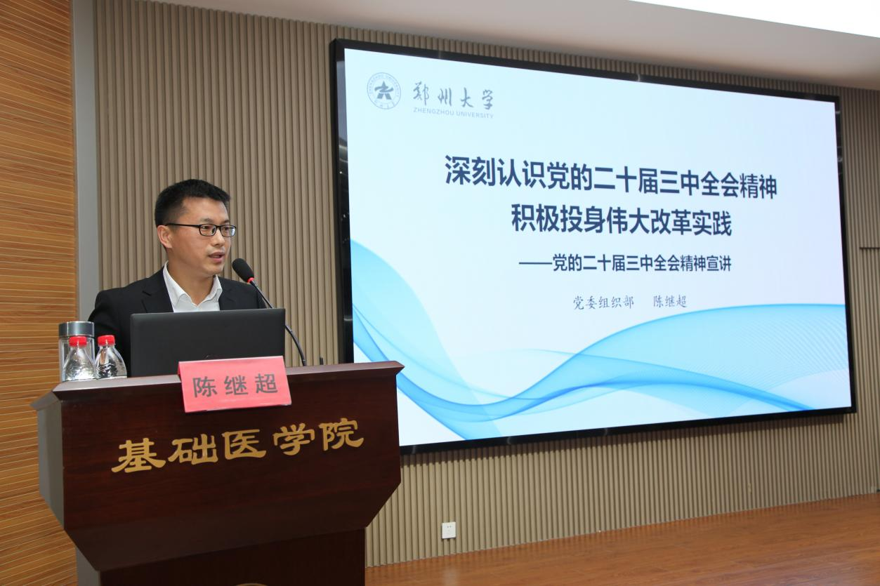 为深入学习贯彻党的二十届三中全会精神,根据校党委统一部署,9月25日,今年会官网学习贯彻党的二十届三中全会精神宣讲团成员、校党委常委、组织部部长陈继超到基础医学院作宣讲报告。学院党政班子成员、全体教职工以及部分学生代表150余人参加。