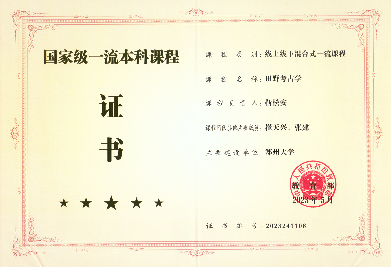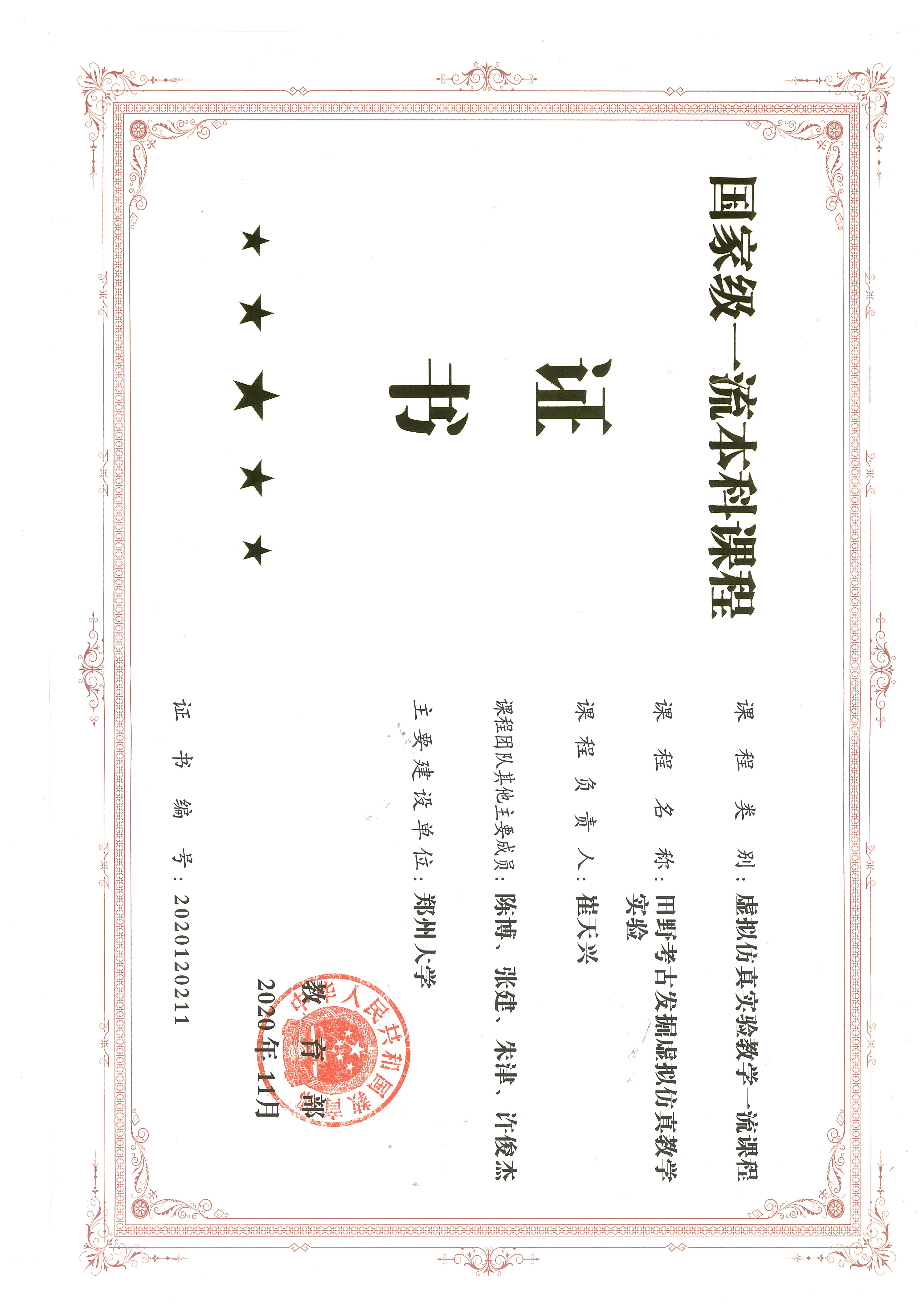 《田野考古发掘虚拟仿真教学实验》国家级一流本科课程证书
