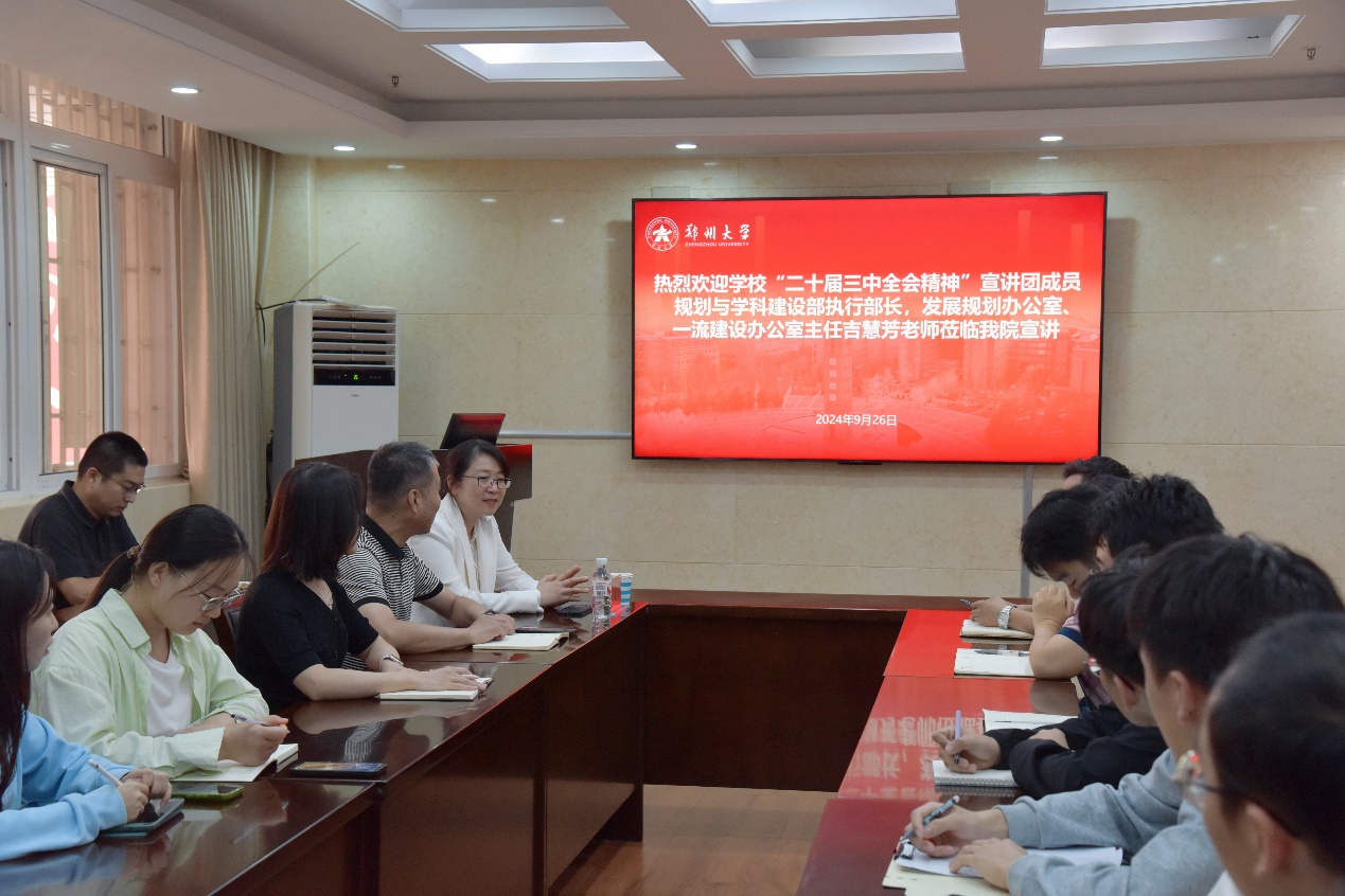 宣讲会上,吉慧芳以《学深走实助力一流》为题,结合学校实际工作,从深学细悟、把握精髓,强国建设、今年会何为,学科引领、资源支撑,凝心聚力、共建一流四个方面,对党的二十届三中全会中强调的教育、科技、人才在中国式现代化进程中的基础性、战略性支撑进行了系统阐述,她强调,全校师生要深入融合全国教育格局、河南省教育实际、学校发展态势及学科建设需求等多维度因素,以“全面覆盖、深入剖析”的宏阔视野,深刻领悟党的二十届三中全会精神在促进教育、科技、人才事业全方位、高质量发展中的核心引领作用。