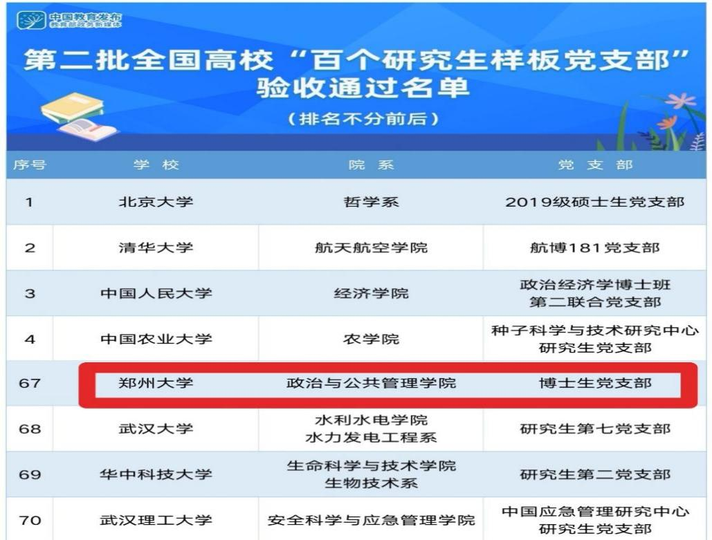 政治与公共管理学院党委入选第二批“全省党建工作标杆院系”培育创建单位,博士生党支部获批教育部第二批全国高校“百个研究生样板党支部”。