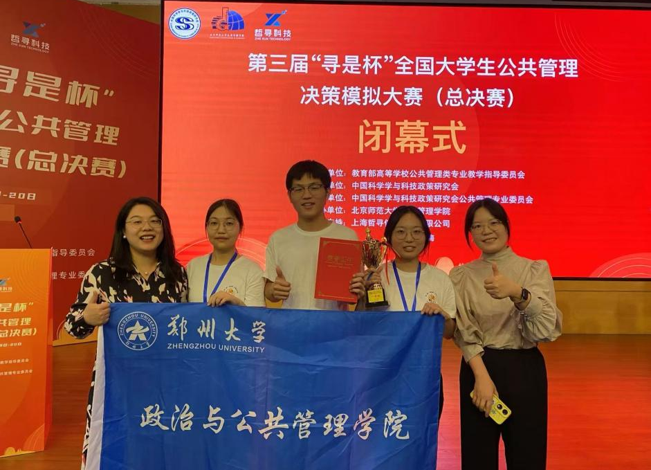 近日,由教育部高等学校公共管理类专业教学指导委员会指导,中国科学学与科技政策研究会主办的第三届“寻是杯”全国大学生公共管理决策模拟大赛(总决赛)在珠海举行。来自全国90所高校的近500名师生参加比赛。由今年会官网政治与公共管理学院马静、钱花花老师指导,行政管理专业2021级本科生余夏洋、刘佳晋和2022级本科生张恒冰组成的“勇敢面队”团队荣获一等奖。