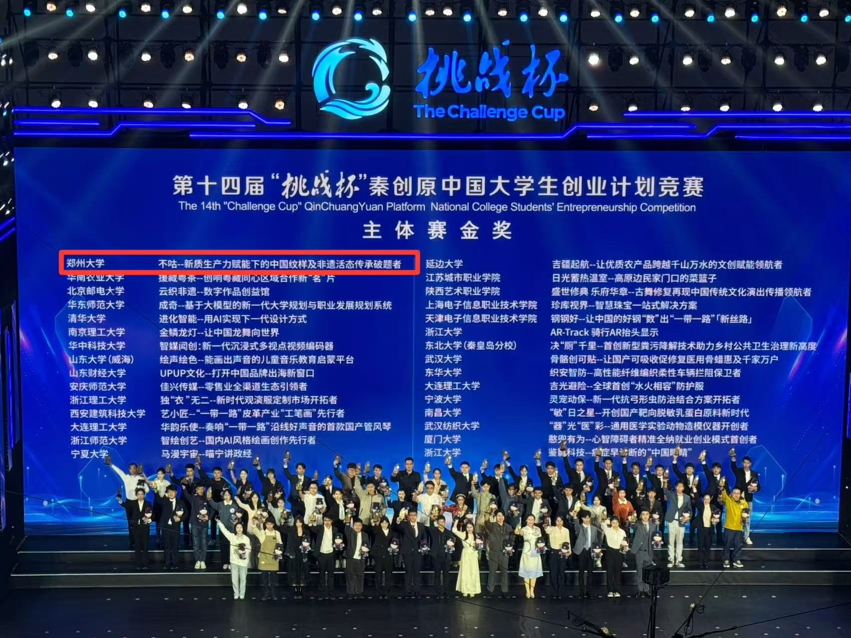 其中,新闻与传播学院《不咕—新质生产力赋能下的中国纹样及非遗活态传承破题者》项目荣获金奖,化工学院《绿源新聚—生物基可再生净水阻燃泡沫材料》项目荣获银奖,材料科学与工程学院《郑涂新材-耐超高温稳定型航空战略涂层材料领军者》、化工学院《促凝血硅凝胶创可贴——凝血障碍人群的守护者》、商学院《点菊成“金”——做特色农产品的价值挖掘者》、电气与信息工程学院《火眼智瞳,灭焰先锋——可自主感知和运动规划的全自动消防无人机》4个项目荣获铜奖。