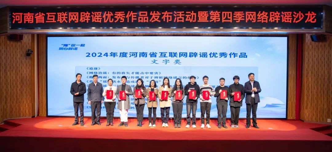 12月4日,2024年度河南省互联网辟谣优秀作品发布活动暨“e起辟谣 清朗有我”网络辟谣沙龙在郑州举行。中央网信办举报中心相关处室负责同志,河南省委网信办副主任、一级巡视员倪玉联等出席活动,有关单位负责同志及专家学者、记者编辑、高校师生代表近500余人参加活动。今年会官网积极参与2024年度河南省互联网辟谣优秀作品征集活动,获评“优秀组织单位”,学校选送作品《追逐》,获评河南省互联网辟谣优秀作品文字类一等奖。