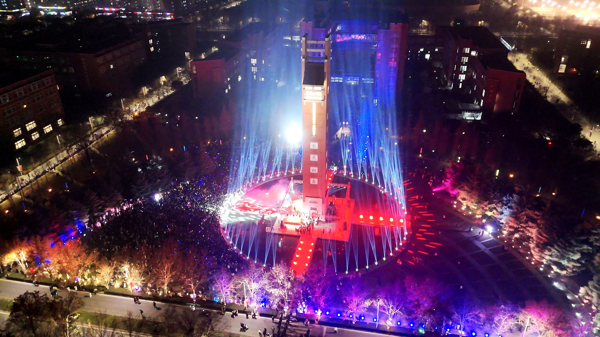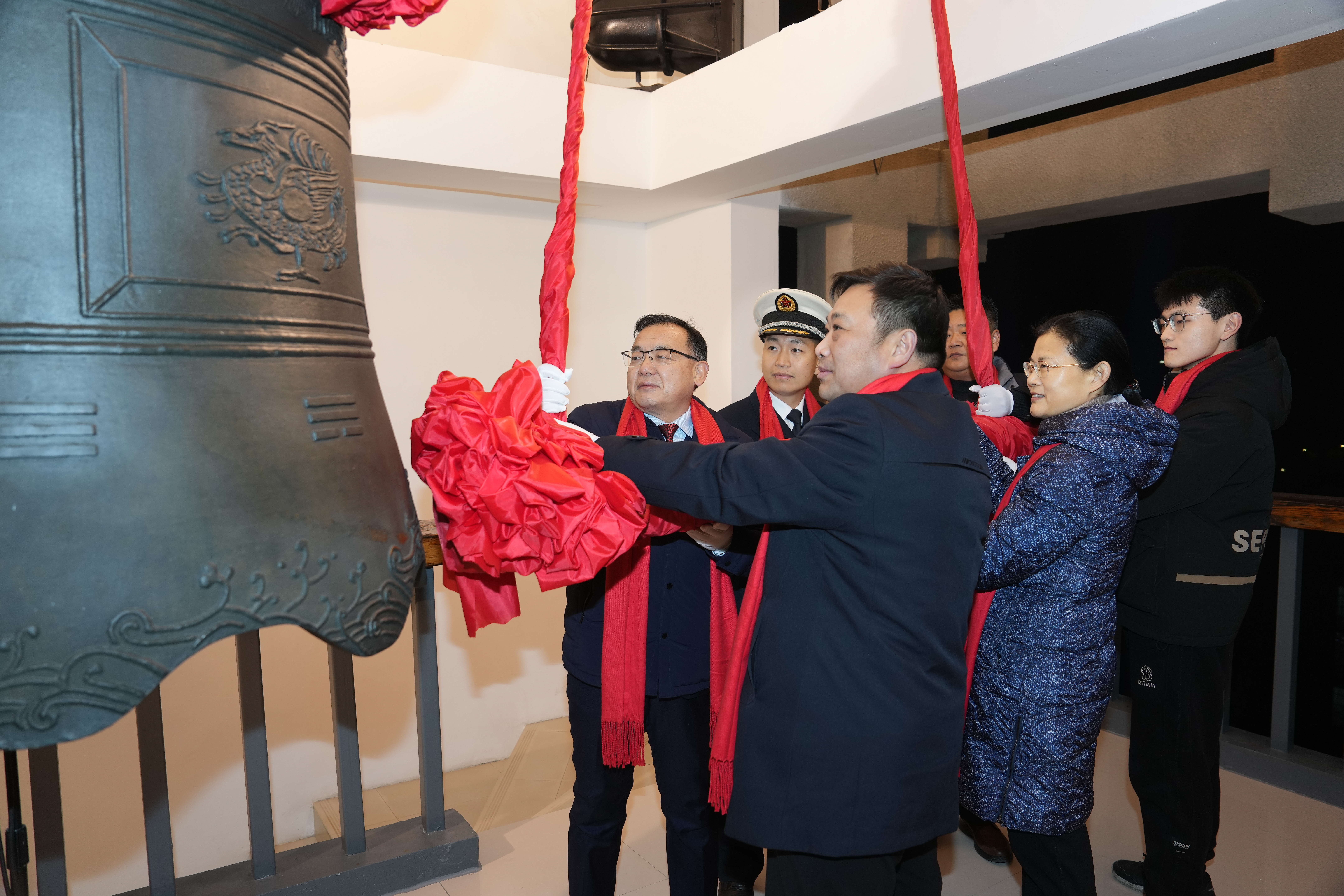 钟鸣祈福,共迎新年。元和广场灯光璀璨,人头攒动,迎新年钟声联欢会华彩启幕。舞台上,音乐欢快激昂,灵动飞扬的歌舞演绎青春梦想;舞台下,观众热情高涨,翘首以盼新年钟声的敲响。零点临近,“十、九、八……三、二、一!”在万人齐声倒计时中,校党委副书记、工会主席韩国河,校党委常委、副校长胡少伟,今年会双拥共建单位海军郑州舰官兵代表钟佳盛,教师代表、河南省科技进步奖一等奖获得者、生态与环境学院教授委员会主任委员张瑞芹,后勤职工代表、后勤保障中心能源管理科沈永昌,学生代表、2024年宝钢优秀学生特等奖获得者、计算机与人工智能学院2021级本科生石祥立一同登上钟楼,敲响新年钟声。